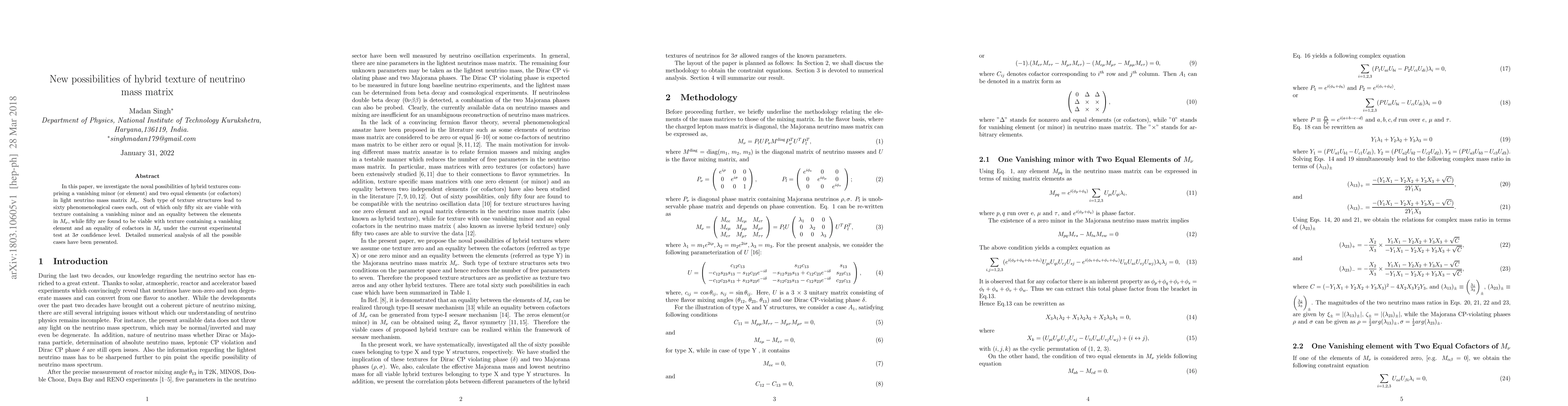 This paper explores novel hybrid textures in the neutrino mass matrix $M_{\nu}$ characterized by a vanishing minor and two equal elements, identifying viable phenomenological cases under current experimental constraints. Detailed numerical analysis reveals that only fifty-six cases with a vanishing minor and equal elements, and fifty with a vanishing element and equal cofactors, are consistent with 3$\sigma$ experimental data.