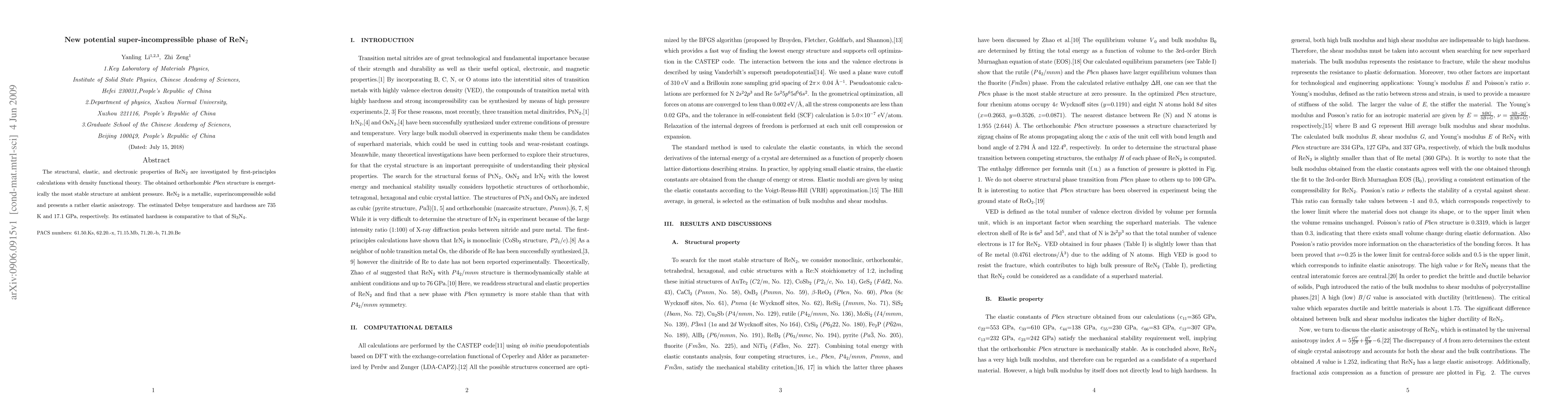 Researchers discovered a new potential super-incompressible phase of ReN2 with properties comparable to Si3N4, including high hardness and elastic anisotropy.