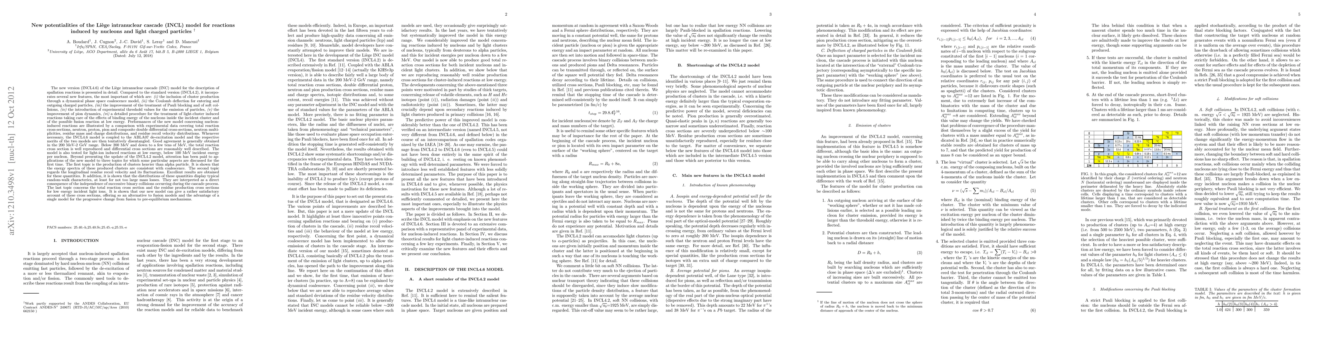 The INCL4.6 model, an updated version of the Li`ege intranuclear cascade model, introduces several enhancements including cluster production, Coulomb deflection, and improved treatment of Pauli blocking. It shows good agreement in predicting nucleon-induced reactions in the 200 MeV-2 GeV range and is also tested for light-ion induced reactions at low energies, addressing new topics such as cluster production and residue recoil velocity.