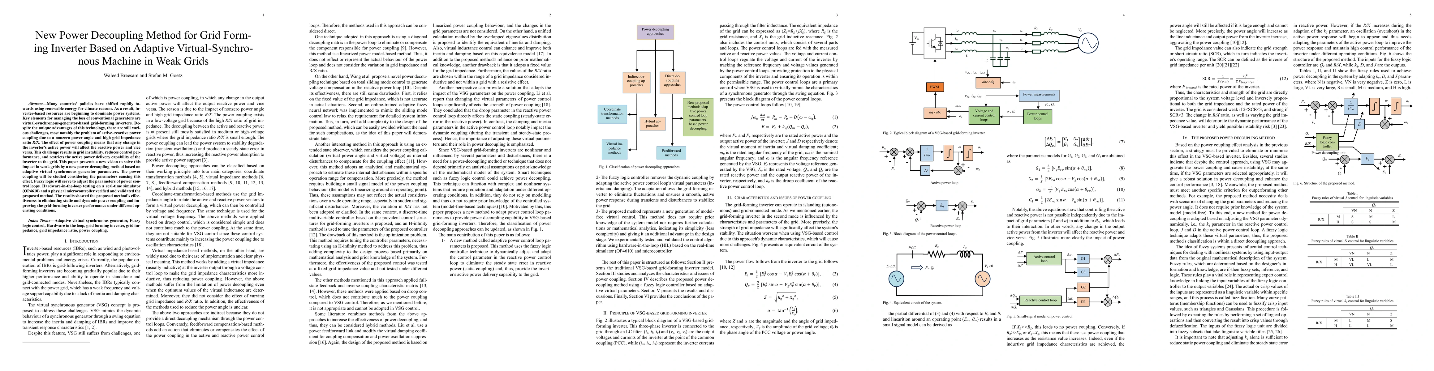 Many countries' policies have shifted rapidly towards using renewable energy for climate reasons. As a result, inverter-based resources are beginning to dominate power systems. Key elements for managing the loss of conventional generators are virtual-synchronous-generator-based grid-forming inverters. Despite the unique advantages of this technology, there are still various challenges, most notably the problem of active-reactive power coupling due to a nonzero power angle and high grid impedance ratio R/X. The effect of power coupling means that any change in the inverter's active power will affect the reactive power and vice versa. This challenge results in grid instability, reduces control performance, and restricts the active power delivery capability of the inverter to the grid. This paper presents a new vision to solve this impact in weak grids by a new power-decoupling method based on adaptive virtual synchronous generator parameters. The power coupling will be studied considering the parameters causing this effect. Fuzzy logic will serve to adjust the parameters of power control loops. Hardware-in-the-loop testing on a real-time simulator (OP4610) and a physical microcontroller verified and validated the proposed method. The results showed the proposed method's effectiveness in eliminating static and dynamic power coupling and improving the grid-forming inverter performance under different operating conditions.