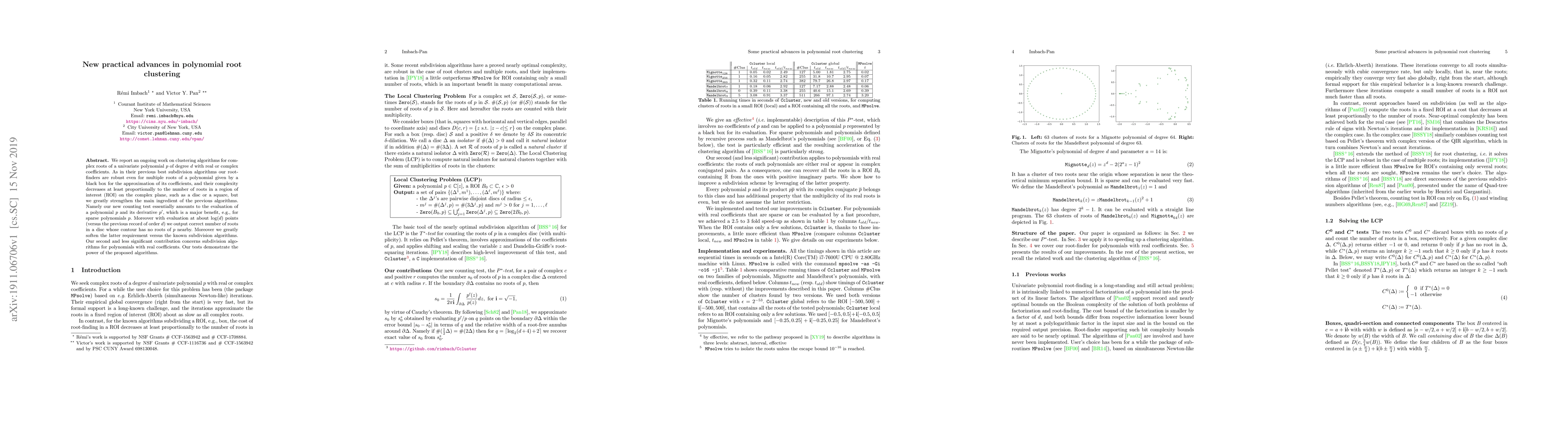 We report an ongoing work on clustering algorithms for complex roots of a univariate polynomial $p$ of degree $d$ with real or complex coefficients. As in their previous best subdivision algorithms our root-finders are robust even for multiple roots of a polynomial given by a black box for the approximation of its coefficients, and their complexity decreases at least proportionally to the number of roots in a region of interest (ROI) on the complex plane, such as a disc or a square, but we greatly strengthen the main ingredient of the previous algorithms. Namely our new counting test essentially amounts to the evaluation of a polynomial $p$ and its derivative $p'$, which is a major benefit, e.g., for sparse polynomials $p$. Moreover with evaluation at about $\log(d)$ points (versus the previous record of order $d$) we output correct number of roots in a disc whose contour has no roots of $p$ nearby. Moreover we greatly soften the latter requirement versus the known subdivision algorithms. Our second and less significant contribution concerns subdivision algorithms for polynomials with real coefficients. Our tests demonstrate the power of the proposed algorithms.