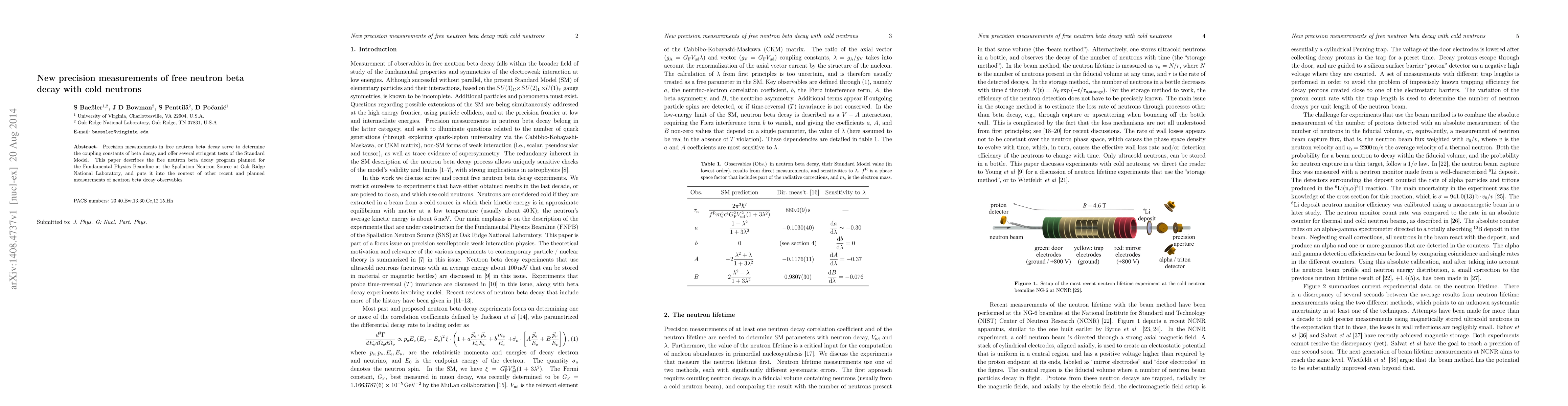 This paper outlines a precision measurement program for free neutron beta decay at the Spallation Neutron Source, aiming to determine coupling constants and test the Standard Model, and situates it within the broader context of recent and future neutron decay experiments.
