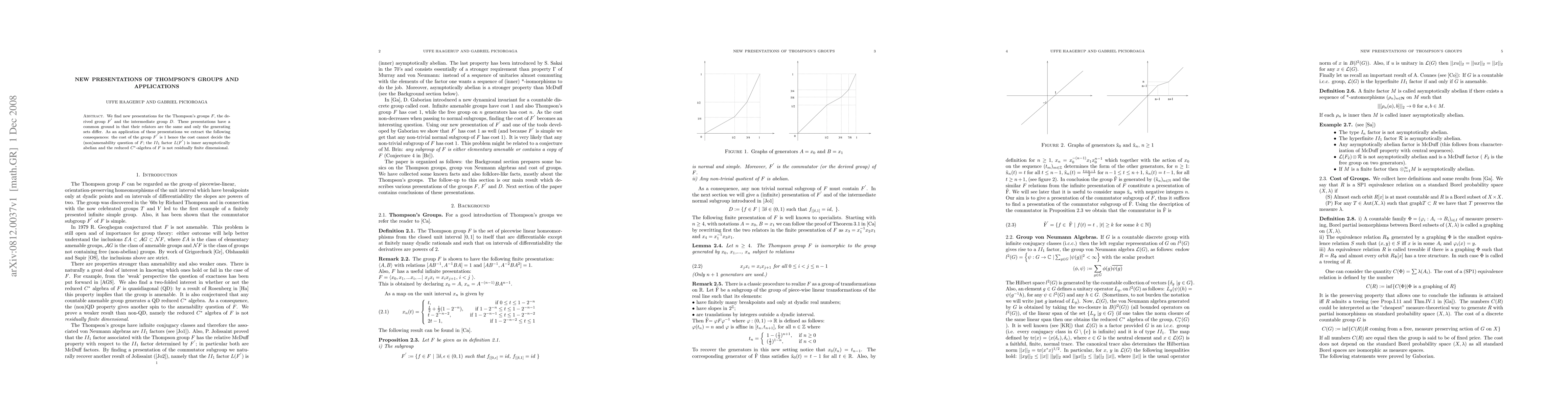 We find new presentations for the Thompson's groups $F$, the derived group $F^{'}$ and the intermediate group $D$. These presentations have a common ground in that their relators are the same and only the generating sets differ. As an application of these presentations we extract the following consequences: the cost of the group $F^{'}$ is 1 hence the cost cannot decide the (non)amenability question of $F$; the $II_1$ factor $L(F^{'})$ is inner asymptotically abelian and the reduced $C^*$-algebra of $F$ is not residually finite dimensional.