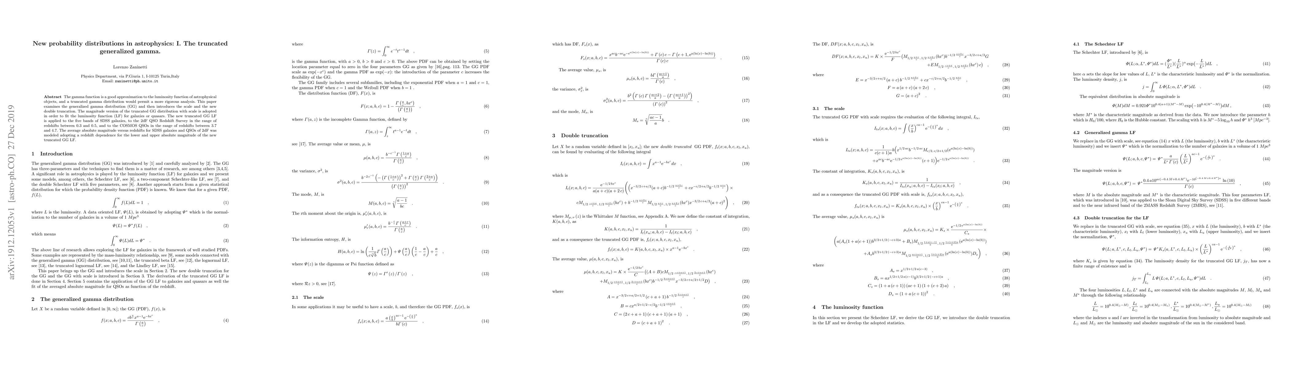 The gamma function is a good approximation to the luminosity function of astrophysical objects, and a truncated gamma distribution would permit a more rigorous analysis. This paper examines the generalized gamma distribution (GG) and then introduces the scale and the new double truncation. The magnitude version of the truncated GG distribution with scale is adopted in order to fit the luminosity function (LF) for galaxies or quasars. The new truncated GG LF is applied to the five bands of SDSS galaxies, to the 2dF QSO Redshift Survey in the range of redshifts between 0.3 and 0.5, and to the COSMOS QSOs in the range of redshifts between 3.7 and 4.7. The average absolute magnitude versus redshifts for SDSS galaxies and QSOs of 2dF was modeled adopting a redshift dependence for the lower and upper absolute magnitude of the new truncated GG LF.