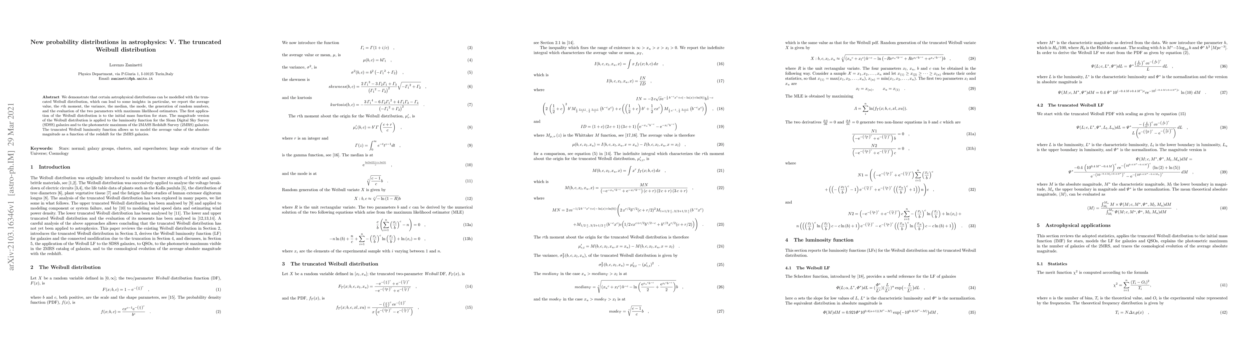 We demonstrate that certain astrophysical distributions can be modelled with the truncated Weibull distribution, which can lead to some insights: in particular, we report the average value, the $r$th moment, the variance, the median, the mode, the generation of random numbers, and the evaluation of the two parameters with maximum likelihood estimators. The first application of the Weibull distribution is to the initial mass function for stars. The magnitude version of the Weibull distribution is applied to the luminosity function for the Sloan Digital Sky Survey (SDSS) galaxies and to the photometric maximum of the 2MASS Redshift Survey (2MRS) galaxies. The truncated Weibull luminosity function allows us to model the average value of the absolute magnitude as a function of the redshift for the 2MRS galaxies.