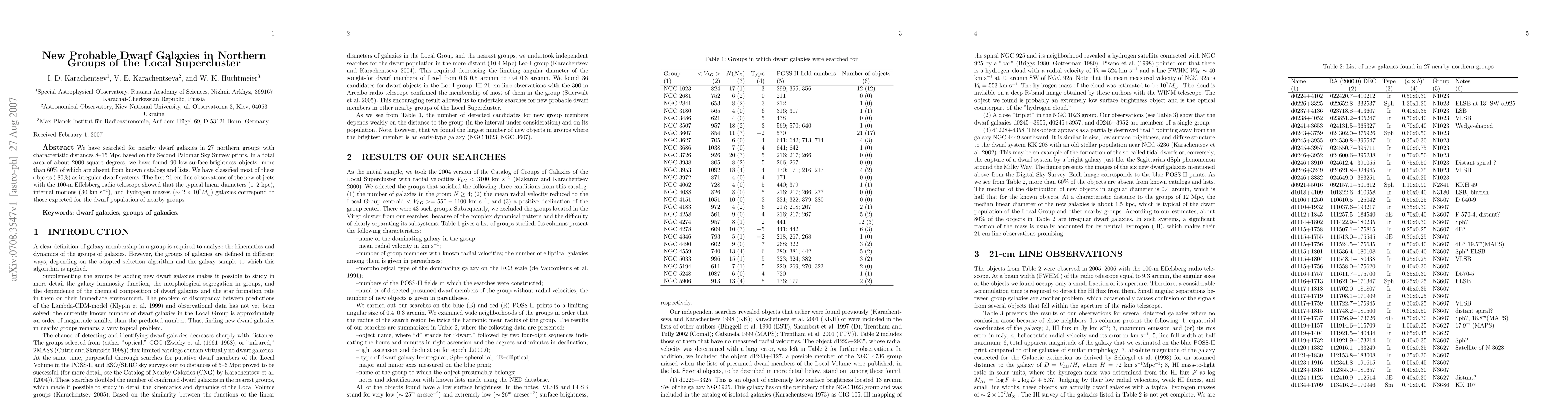 We have searched for nearby dwarf galaxies in 27 northern groups with characteristic distances 8-15 Mpc based on the Second Palomar Sky Survey prints. In a total area of about 2000 square degrees, we have found 90 low-surface-brightness objects, more than 60% of which are absent from known catalogs and lists. We have classified most of these objects (~80%) as irregular dwarf systems. The first 21-cm line observations of the new objects with the 100-m Effelsberg radio telescope showed that the typical linear diameters (1-2 kpc), internal motions (30 km/s), and hydrogen masses (~2*10^7M_sun) galaxies correspond to those expected for the dwarf population of nearby groups.