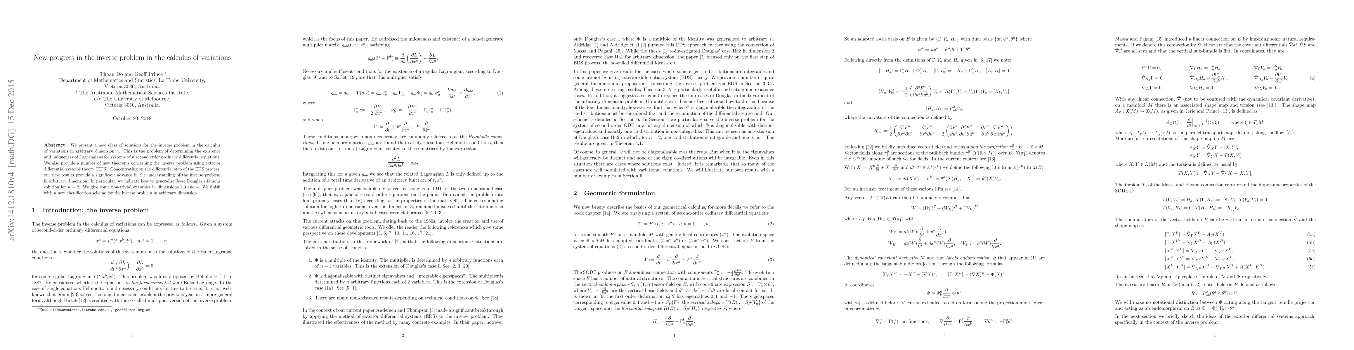We present a new class of solutions for the inverse problem in the calculus of variations in arbitrary dimension $n$. This is the problem of determining the existence and uniqueness of Lagrangians for systems of $n$ second order ordinary differential equations. We also provide a number of new theorems concerning the inverse problem using exterior differential systems theory (EDS). Concentrating on the differential step of the EDS process, our new results provide a significant advance in the understanding of the inverse problem in arbitrary dimension. In particular, we indicate how to generalise Jesse Douglas's famous solution for $n=2$. We give some non-trivial examples in dimensions 2,3 and 4. We finish with a new classification scheme for the inverse problem in arbitrary dimension.