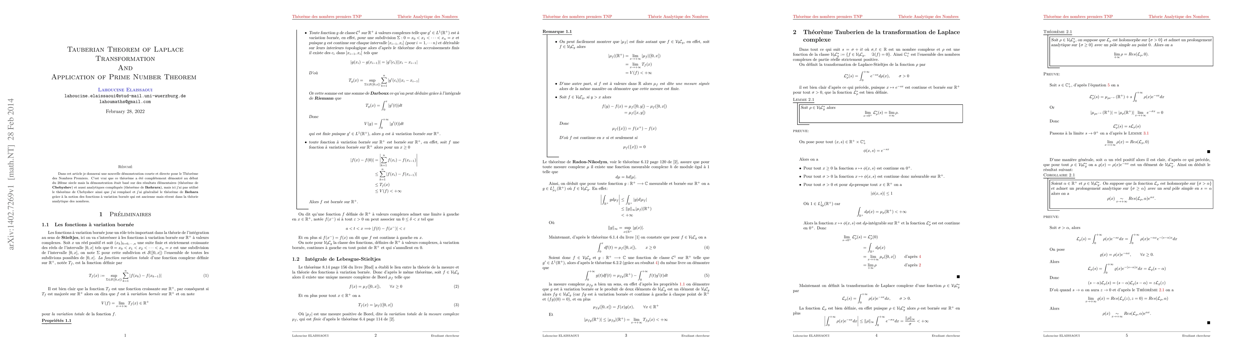 We give here a new proof of a Tauberian Theorem of complex Laplace transform using the Theory of measure and theory of function with bounded variations. However we deduce the simple proof of Prime Number Theorem.