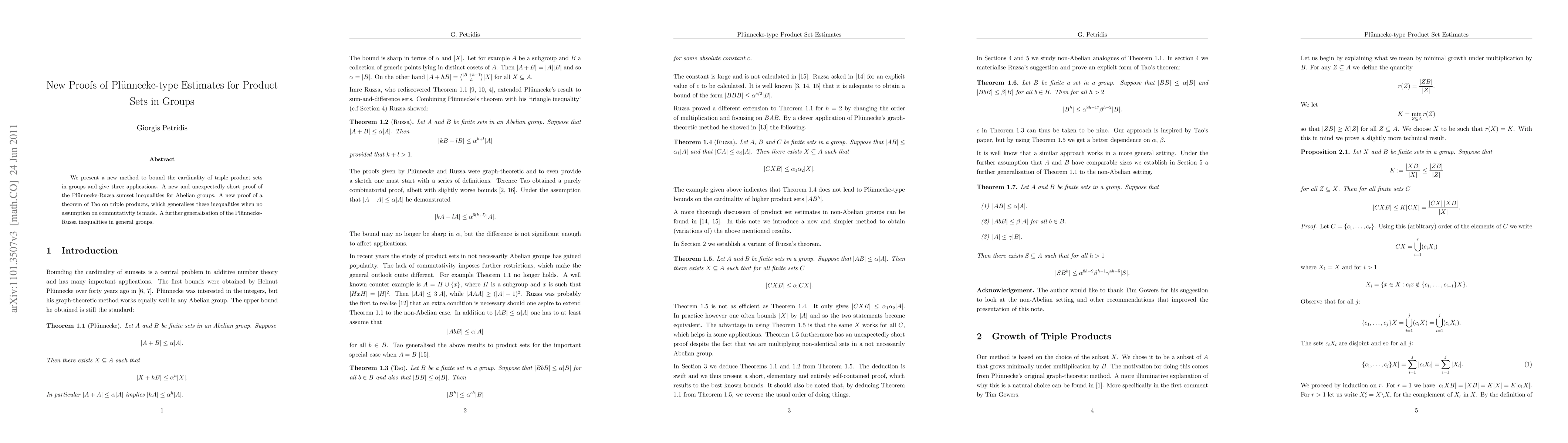 We present a new method to bound the cardinality of triple product sets in groups and give three applications. A new and unexpectedly short proof of the Plunnecke-Ruzsa sumset inequalities for Abelian groups. A new proof of a theorem of Tao on triple products, which generalises these inequalities when no assumption on commutativity is made. A further generalisation of the Plunnecke-Ruzsa inequalities in general groups.
