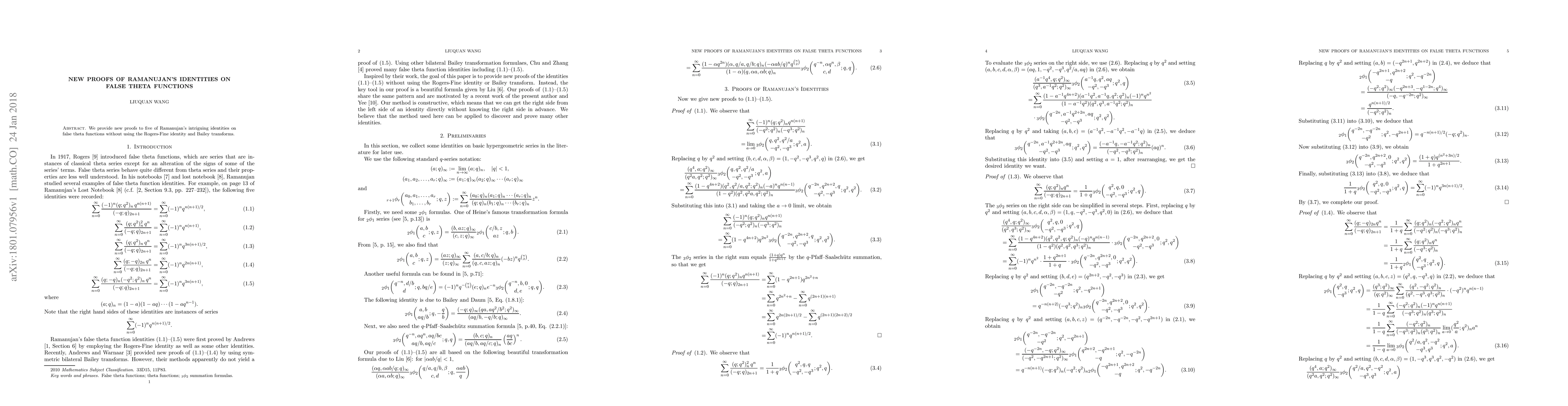 The paper provides new proofs for Ramanujan's identities on false theta functions using a transformation formula by Liu, avoiding the Rogers-Fine identity and Bailey transforms.