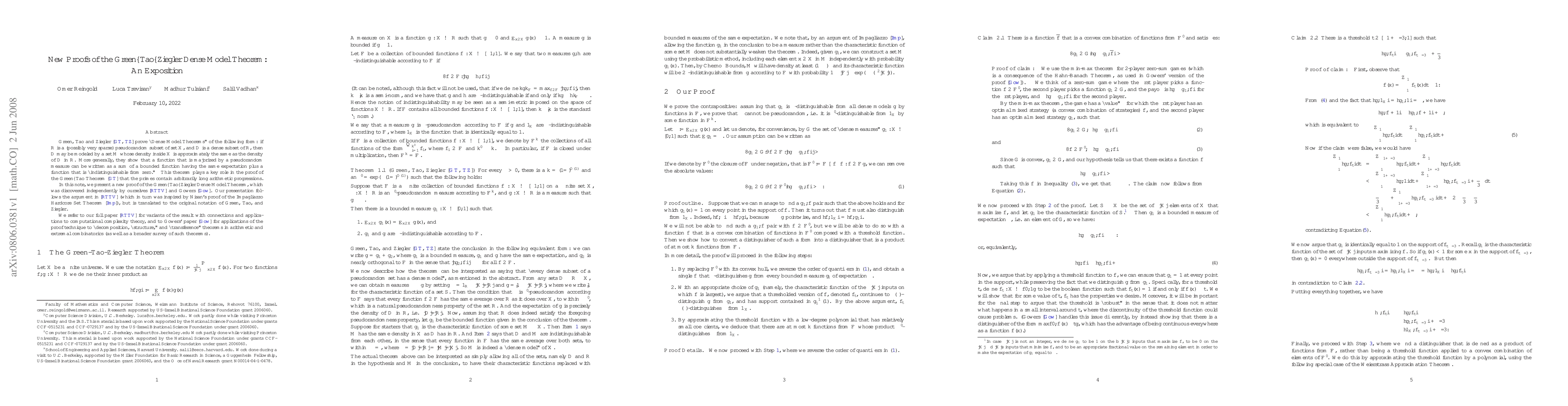 Green, Tao and Ziegler prove ``Dense Model Theorems'' of the following form: if R is a (possibly very sparse) pseudorandom subset of set X, and D is a dense subset of R, then D may be modeled by a set M whose density inside X is approximately the same as the density of D in R. More generally, they show that a function that is majorized by a pseudorandom measure can be written as a sum of a bounded function having the same expectation plus a function that is ``indistinguishable from zero.'' This theorem plays a key role in the proof of the Green-Tao Theorem that the primes contain arbitrarily long arithmetic progressions. In this note, we present a new proof of the Green-Tao-Ziegler Dense Model Theorem, which was discovered independently by ourselves and Gowers. We refer to our full paper for variants of the result with connections and applications to computational complexity theory, and to Gowers' paper for applications of the proof technique to ``decomposition, ``structure,'' and ``transference'' theorems in arithmetic and extremal combinatorics (as well as a broader survey of such theorems).