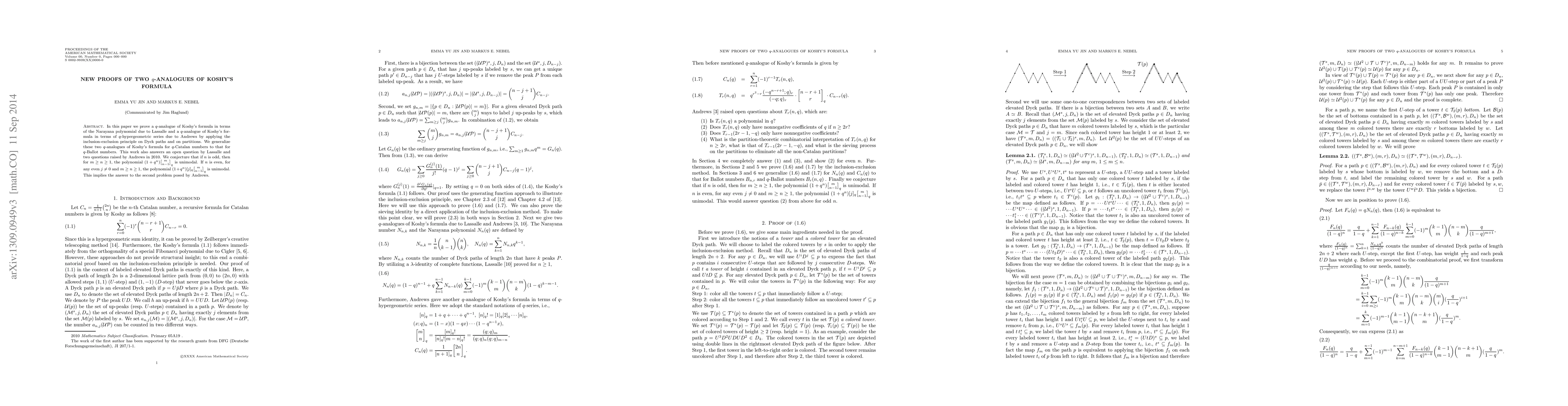 Researchers prove new $q$-analogues of Koshy's formula for ballot numbers using inclusion-exclusion principles on Dyck paths and partitions, answering open questions and conjecturing unimodality properties.
