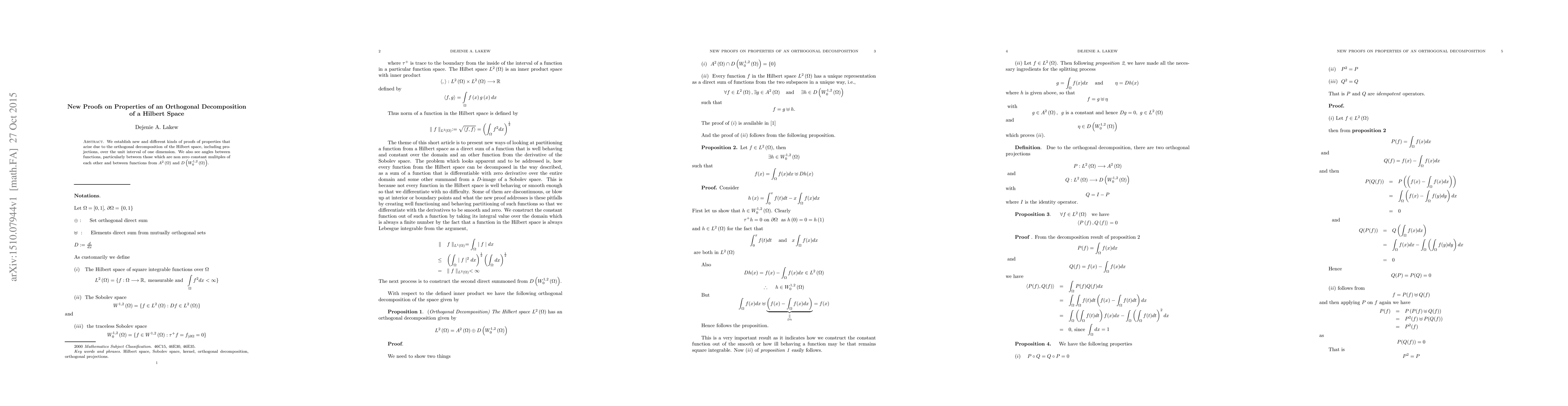 We establish new and different kinds of proofs of properties that arise due to the orthogonal decomposition of the Hilbert space, including projections, over the unit interval of one dimension. We also see angles between functions, particularly between those which are non zero constant multiples of each other and between functions from the kernel space and the derivative image of the trace less Sobolev space.