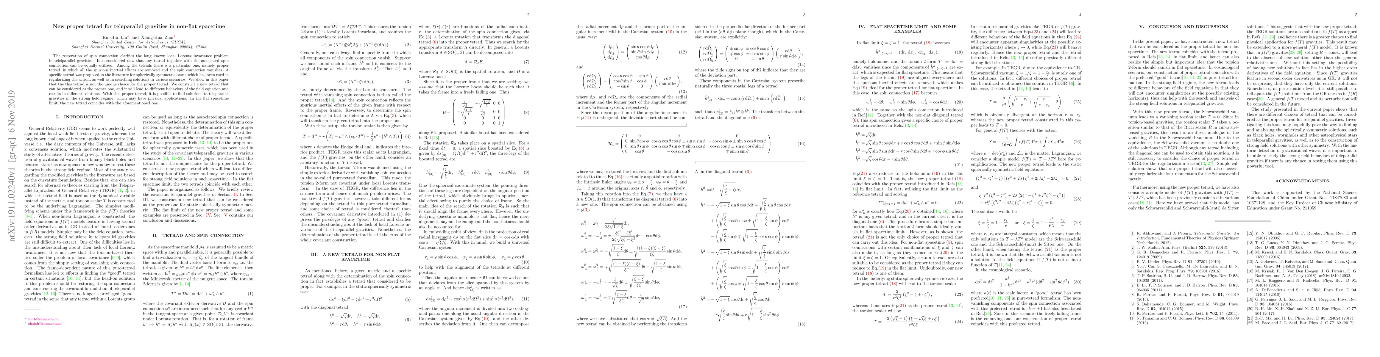 The restoration of spin connection clarifies the long known local Lorentz invariance problem in telelparallel gravities. It is considered now that any tetrad together with the associated spin connection can be equally utilized. Among the tetrads there is a particular one, namely proper tetrad, in which all the spurious inertial effects are removed and the spin connection vanishes. A specific tetrad was proposed in the literature for spherically symmetric cases, which has been used in regularizing the action, as well as in searching solutions in various scenarios. We show in this paper that the this tetrad is not the unique choice for the proper tetrad. We construct a new tetrad that can be considered as the proper one, and it will lead to different behaviors of the field equation and results in different solutions. With this proper tetrad, it is possible to find solutions to teleparallel gravities in the strong field regime, which may have physical applications. In the flat spacetime limit, the new tetrad coincides with the aforementioned one.