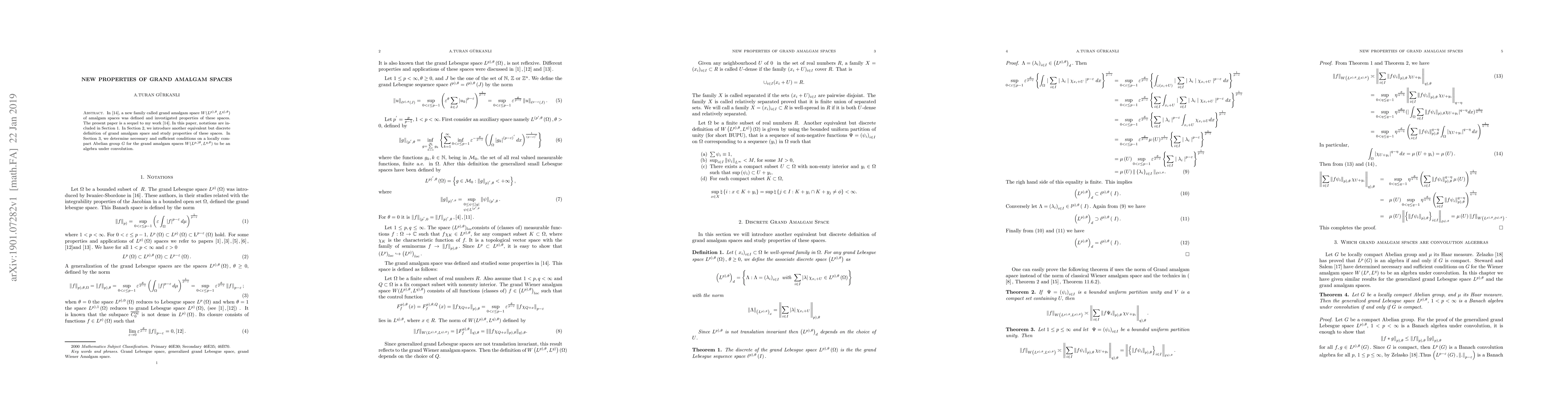 This paper explores new properties of grand amalgam spaces, providing a discrete definition and examining conditions under which these spaces form an algebra under convolution on locally compact Abelian groups. The study extends previous work by defining equivalent notations and investigating structural properties.