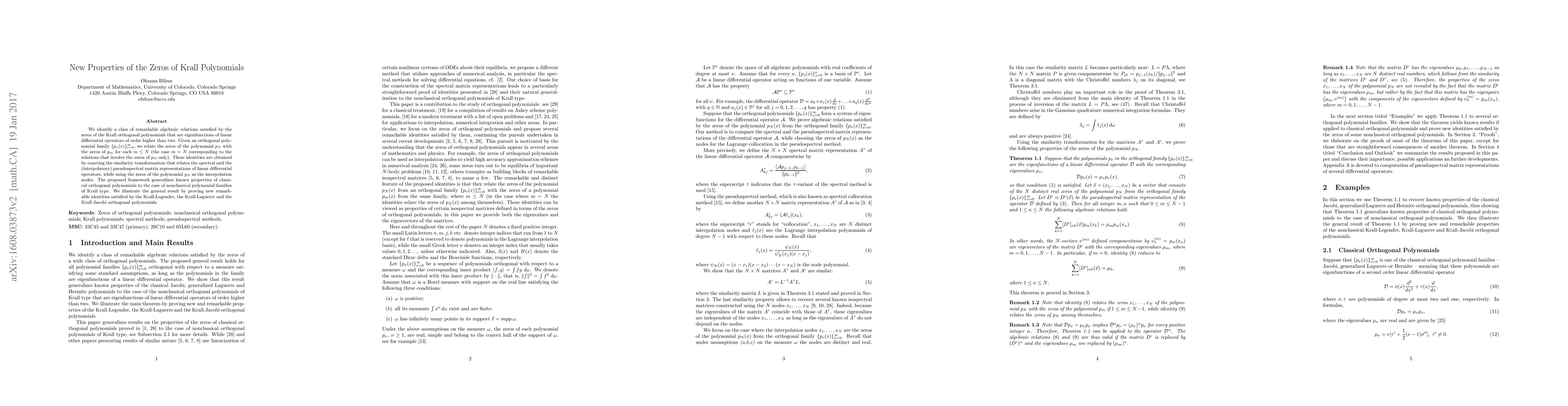 This paper identifies new algebraic relations among the zeros of Krall orthogonal polynomials, revealing their unique properties through transformations connecting spectral and pseudospectral representations. It extends classical orthogonal polynomial identities to Krall polynomials and demonstrates these properties for Krall-Legendre, Krall-Laguerre, and Krall-Jacobi polynomials.