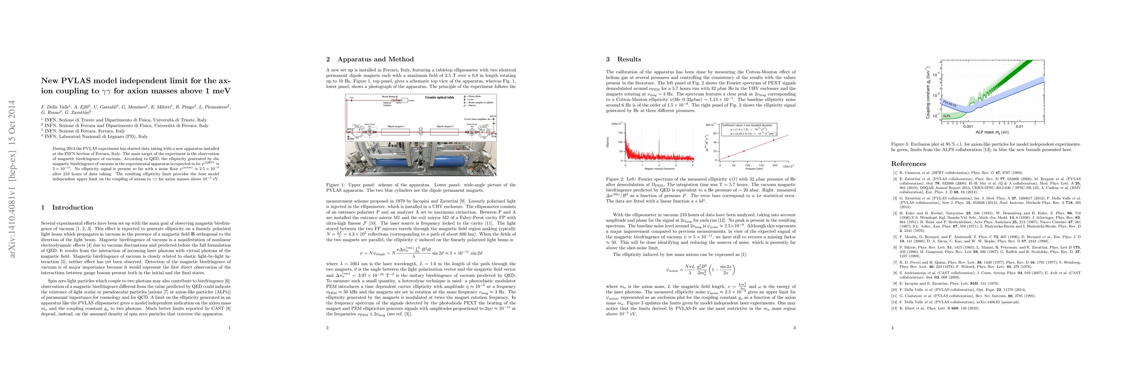 The PVLAS experiment in 2014 set new model-independent limits on the axion coupling to photons for axion masses above 1 meV, finding no signal above a noise floor of $\psi^{\rm(noise)} \approx 2.5\times10^{-9}$. This result provides the best constraint on axion-photon interactions in this mass range.