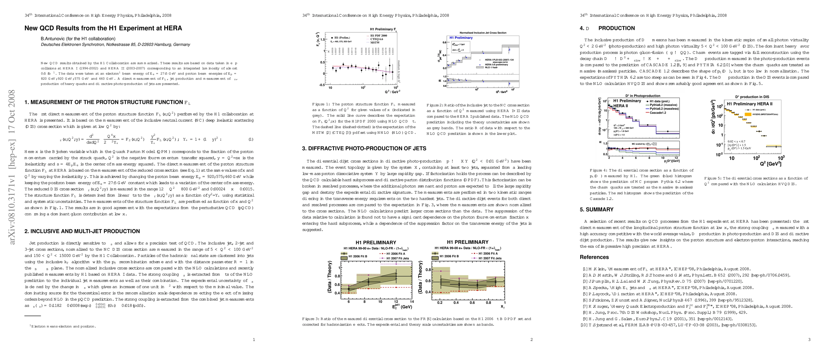 New QCD results obtained by the H1 Collaboration are summarized. These results are based on data taken in $e^{\pm}p$ collisions at HERA I (1994-2002) and HERA II (2003-2007) corresponding to an integrated luminosity of almost $\rm 0.5 fb^{-1}$. The data were taken at an electron {Electron means electron and positron.} beam energy of $E_{e}=27.5$ GeV and proton beam energies of $\rm E_{p}=820 GeV, 920 GeV, 575 GeV$ and $\rm 460 GeV$. A direct measurement of $F_{L}$, jet production and measurement of $\alpha_{s}$, production of heavy quarks and diffractive photo-production of jets are presented.