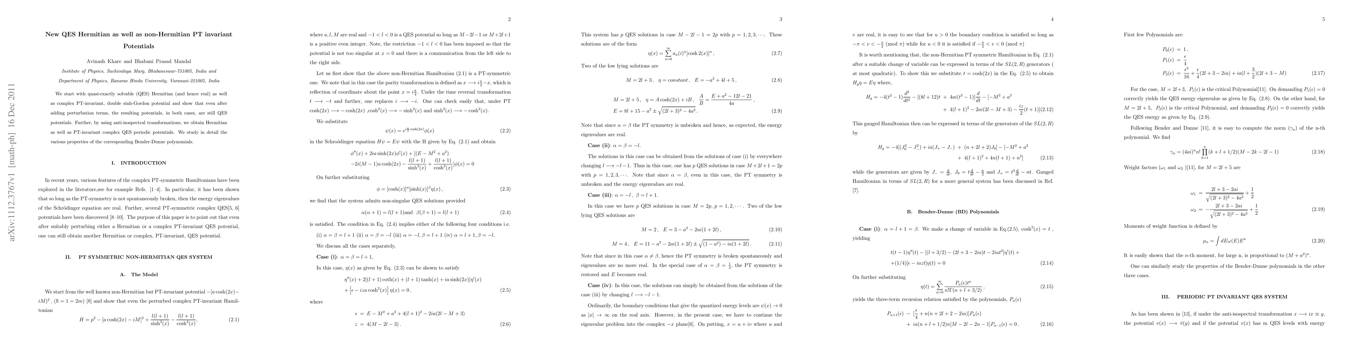This paper explores quasi-exactly solvable (QES) Hermitian and non-Hermitian PT-invariant potentials derived from the double sinh-Gordon potential, demonstrating their persistence under perturbation. It also introduces PT-invariant complex QES periodic potentials via anti-isospectral transformations and analyzes the properties of Bender-Dunne polynomials.