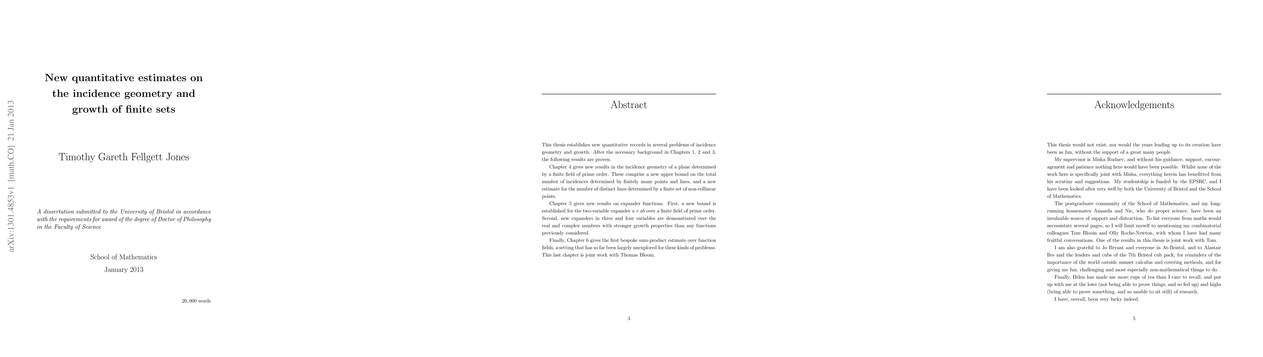 This thesis provides new quantitative records in incidence geometry and growth, including improved bounds on incidences in finite planes and novel expander functions with stronger growth properties. The work also introduces the first bespoke sum-product estimate over function fields, a significant contribution in an underexplored area.