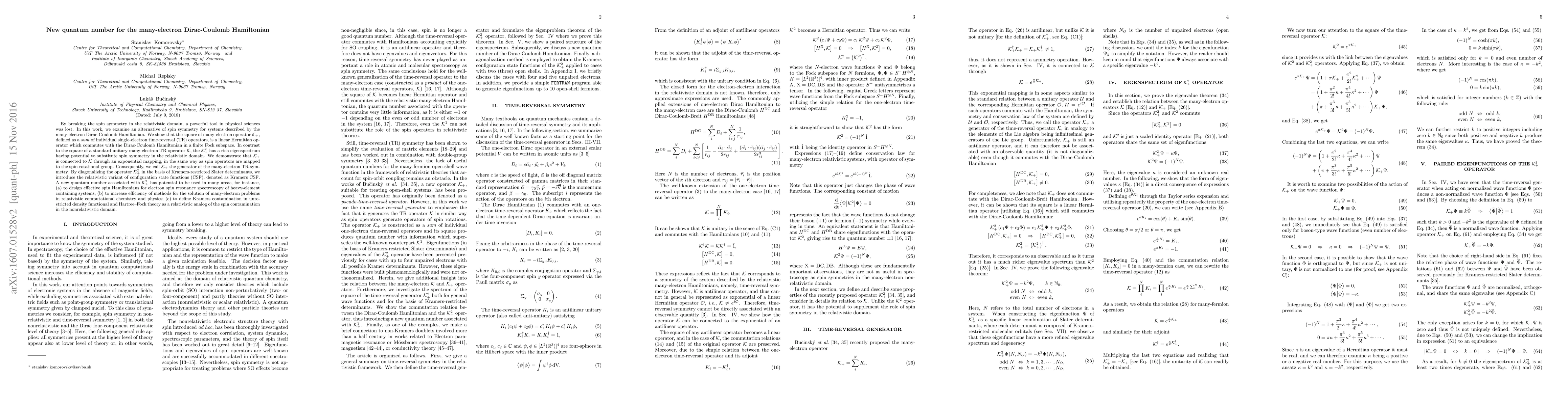 By breaking the spin symmetry in the relativistic domain, a powerful tool in physical sciences was lost. In this work, we examine an alternative of spin symmetry for systems described by the many-electron Dirac-Coulomb Hamiltonian. We show that the square of many-electron operator $\mathcal{K}_+$, defined as a sum of individual single-electron time-reversal (TR) operators, is a linear Hermitian operator which commutes with the Dirac-Coulomb Hamiltonian in a finite Fock subspace. In contrast to the square of a standard unitary many-electron TR operator $\mathcal{K}$, the $\mathcal{K}^2_+$ has a rich eigenspectrum having potential to substitute spin symmetry in the relativistic domain. We demonstrate that $\mathcal{K}_+$ is connected to $\mathcal{K}$ through an exponential mapping, in the same way as spin operators are mapped to the spin rotational group. Consequently, we call $\mathcal{K}_+$ the generator of the many-electron TR symmetry. By diagonalizing the operator $\mathcal{K}^2_+$ in the basis of Kramers-restricted Slater determinants, we introduce the relativistic variant of configuration state functions (CSF), denoted as Kramers CSF. A new quantum number associated with $\mathcal{K}^2_+$ has potential to be used in many areas, for instance, (a) to design effective spin Hamiltonians for electron spin resonance spectroscopy of heavy-element containing systems; (b) to increase efficiency of methods for the solution of many-electron problems in relativistic computational chemistry and physics; (c) to define Kramers contamination in unrestricted density functional and Hartree--Fock theory as a relativistic analog of the spin contamination in the nonrelativistic domain.