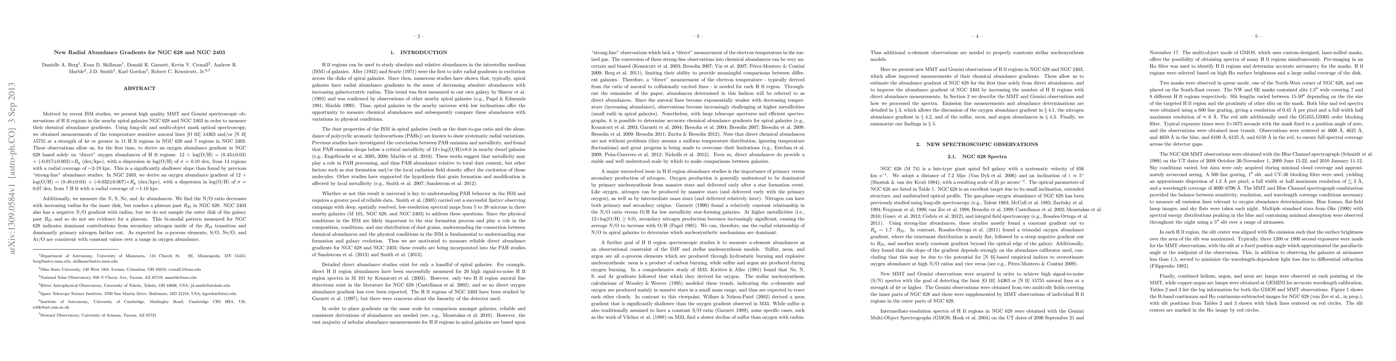 This paper presents high-quality spectroscopic observations of NGC 628 and NGC 2403 to determine their chemical abundance gradients, finding shallower oxygen gradients than previous studies. The N/O ratio in NGC 628 shows a transition from secondary to primary nitrogen contributions beyond the inner disk.