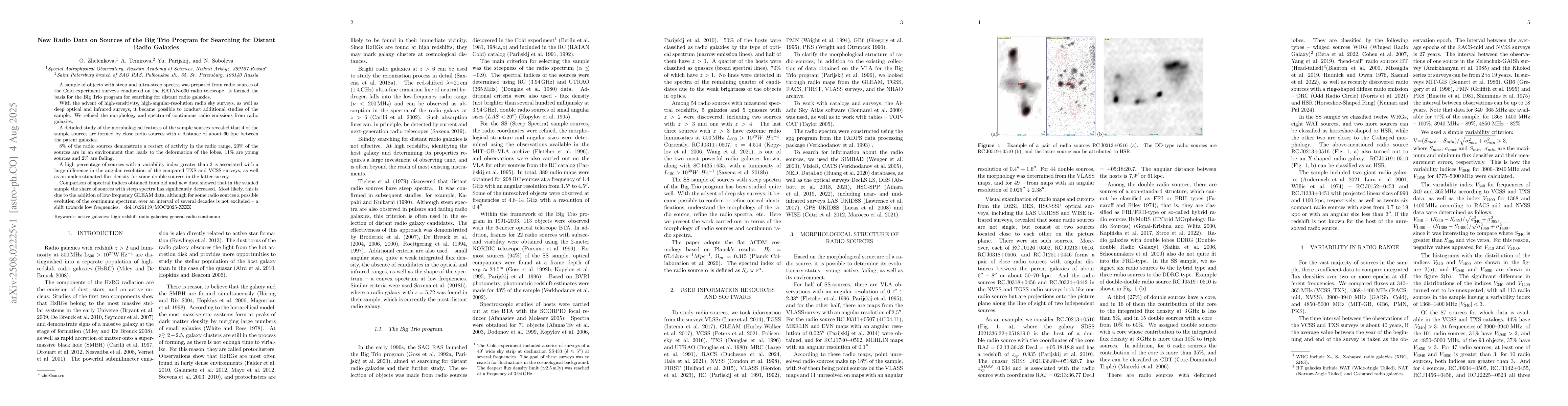 A sample of objects with steep and ultra-steep spectra was prepared from radio sources of the Cold experiment surveys conducted on the RATAN-600 radio telescope. It formed the basis for the Big Trio program for searching for distant radio galaxies. With the advent of high-sensitivity, high-angular-resolution radio sky surveys, as well as deep optical and infrared surveys, it became possible to conduct additional studies of the sample. We refined the morphology and spectra of continuous radio emissions from radio galaxies. A detailed study of the morphological features of the sample sources revealed that 4 of the sample sources are formed by close radio sources with a distance of about 60 kpc between the parent galaxies. 8% of the radio sources demonstrate a restart of activity in the radio range, 20% of the sources are in an environment that leads to the deformation of the lobes, 11% are young sources and 2% are fading. A high percentage of sources with a variability index greater than 3 is associated with a large difference in the angular resolution of the compared TXS and VCSS surveys, as well as an underestimated flux density for some double sources in the latter survey. Comparison of spectral indices obtained from old and new data showed that in the studied sample the share of sources with steep spectra has significantly decreased. Most likely, this is due to the addition of low-frequency GLEAM data, although for some radio sources a possible evolution of the continuum spectrum over an interval of several decades is not excluded -- a shift towards low frequencies.