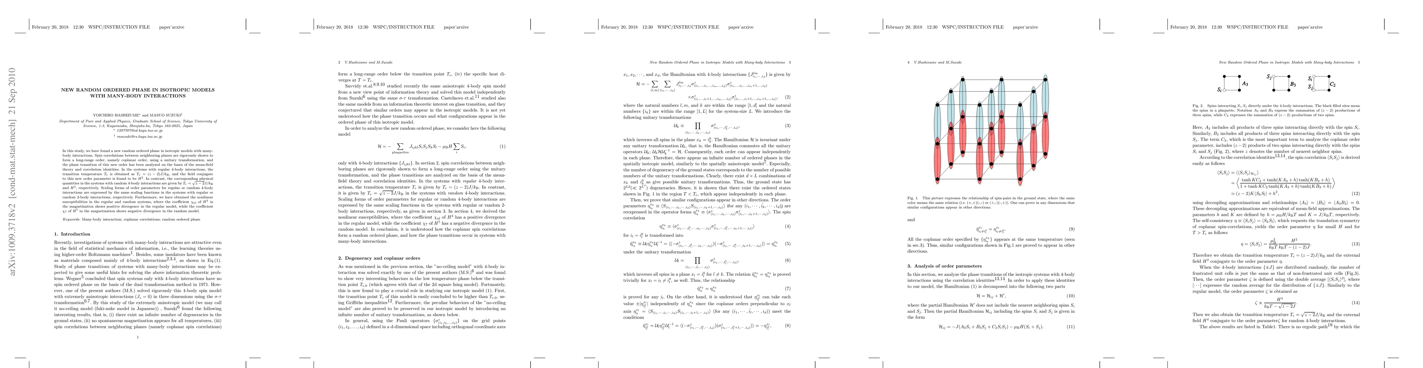 In this study, we have found a new random ordered phase in isotropic models with many-body interactions. Spin correlations between neighboring planes are rigorously shown to form a long-range order, namely coplanar order, using a unitary transformation, and the phase transition of this new order has been analyzed on the bases of the mean-field theory and correlation identities. In the systems with regular 4-body interactions, the transition temperature $T_{\text{c}}$ is obtained as $T_{\text{c}}=(z-2)J/k_{\text{B}}$, and the field conjugate to this new order parameter is found to be $H^2$. In contrast, the corresponding physical quantities in the systems with random 4-body interactions are given by $T_{\text{c}}=\sqrt{z-2}J/k_{\text{B}}$ and $H^4$, respectively. Scaling forms of order parameters for regular or random 4-body interactions are expressed by the same scaling functions in the systems with regular or random 2-body interactions, respectively. Furthermore, we have obtained the nonlinear susceptibilities in the regular and random systems, where the coefficient $\chi_{\text{nl}}$ of $H^3$ in the magnetization shows positive divergence in the regular model, while the coefficient $\chi_{7}$ of $H^7$ in the magnetization shows negative divergence in the random model.