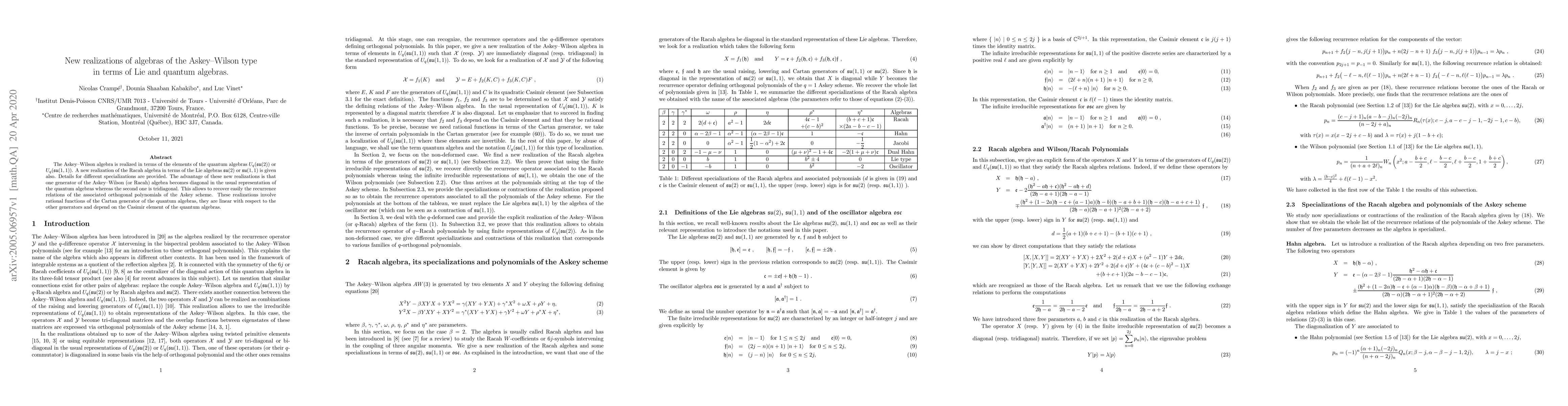 The paper presents new realizations of the Askey-Wilson and Racah algebras in terms of quantum and Lie algebras, respectively, facilitating the recovery of recurrence relations for associated orthogonal polynomials. These new realizations simplify the structure of the algebras, making one generator diagonal and the other tridiagonal.