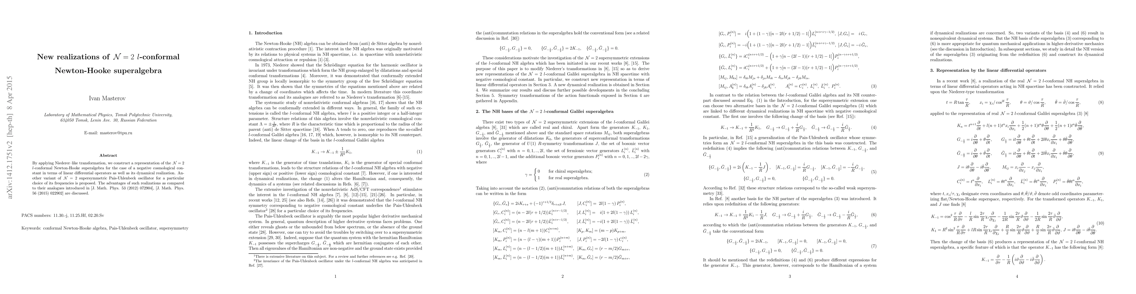 This paper constructs a representation of the N=2 l-conformal Newton-Hooke superalgebra using Niederer-like transformations, providing a dynamical realization in terms of linear differential operators. It also proposes a variant of the N=2 supersymmetric Pais-Uhlenbeck oscillator, highlighting advantages over previous realizations.
