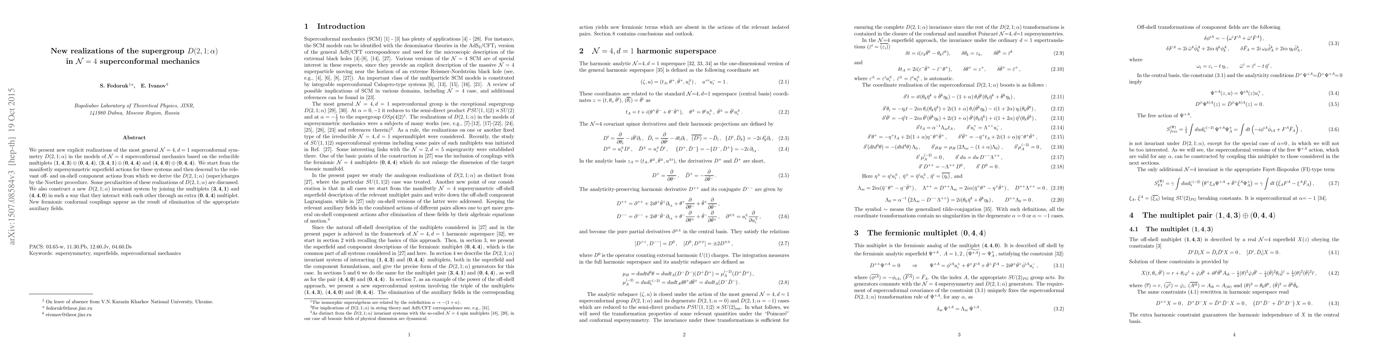 This paper introduces new explicit realizations of the N=4, d=1 superconformal symmetry D(2,1;α) in N=4 superconformal mechanics, deriving (super)charges from supersymmetric superfield actions and discussing their peculiarities. It also constructs a new D(2,1;α) invariant system through the interaction of specific multiplets.