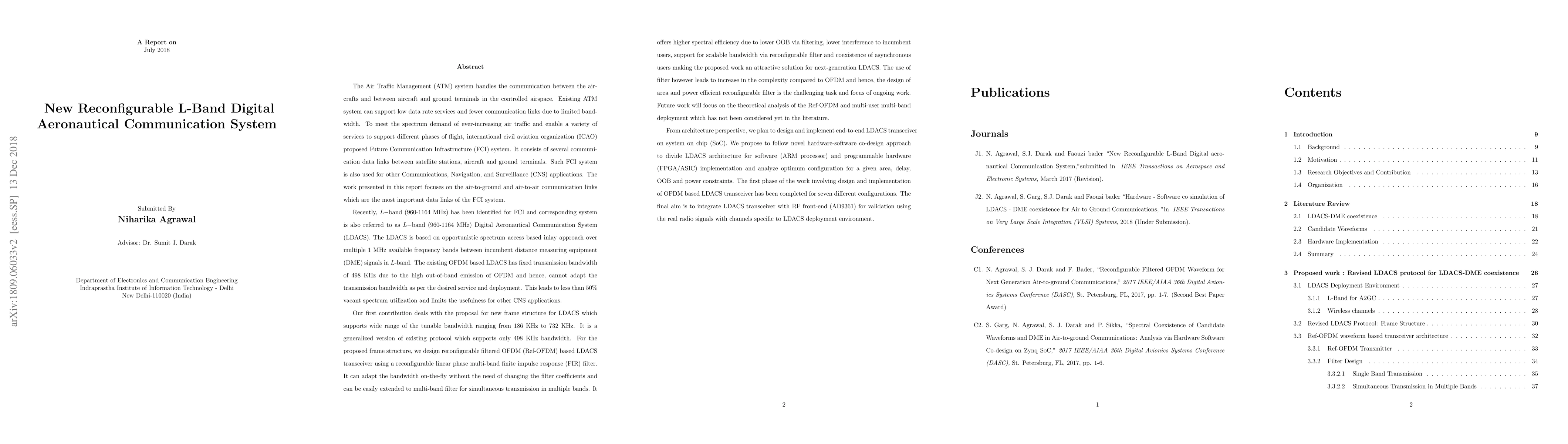To meet an ever-increasing demand of the spectrum for communication between aircraft and ground terminals, orthogonal frequency division multiplexing (OFDM) based L-band (960-1164MHz) Digital Aeronautical Communication System (LDACS) has been recently proposed as an alternative to existing narrowband systems. However, OFDM based LDACS needs additional control signaling for time and frequency alignment and the use of cyclic prefix and high out-of-band emission limits the spectrum utilization efficiency to less than 50%. In this paper, a new waveform has been proposed which offers better spectrum utilization than OFDM without compromising on computational complexity and interference to legacy users in L-band. It also allows transceivers to dynamically adapt the transmission bandwidth to meet the desired quality of service. Since the proposed waveform employs a reconfigurable multiband linear phase filter, it is referred to as reconfigurable filtered OFDM (Ref-OFDM). Simulation results and extensive analysis show that the proposed Ref-OFDM offers around 40 dB better out-of-band emission than OFDM which in turn leads to significant increase in the transmission bandwidth for a given BER and interference constraints. The computational complexity of Ref-OFDM is slightly higher than that of OFDM but it is significantly less than other waveforms making Ref-OFDM an attractive waveform for next generation air-to-ground communications. An end to end hardware prototyping of LDACS-DME coexistence is also presented in this report.