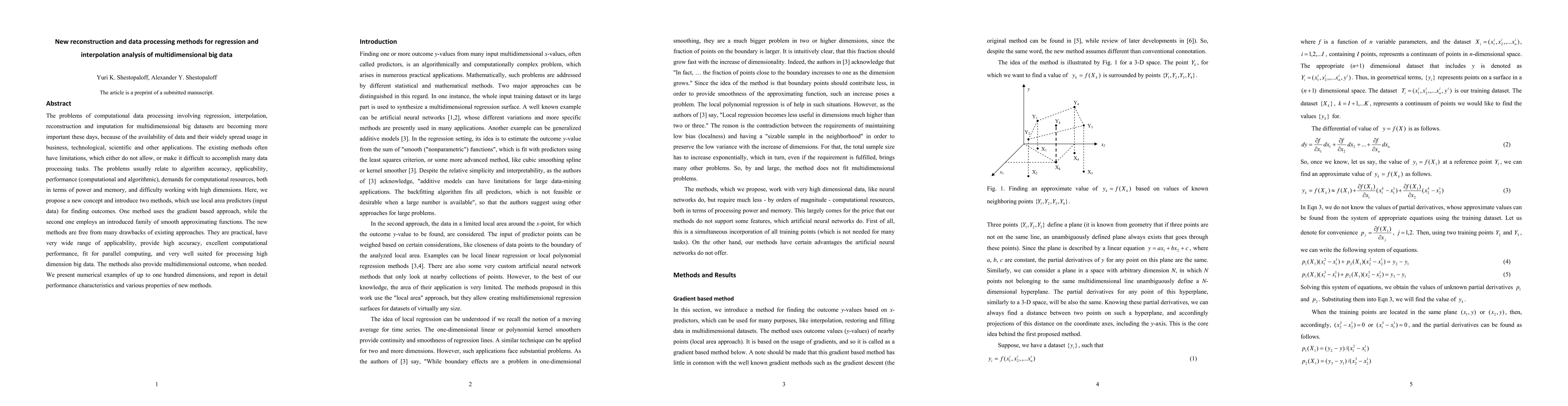 The problems of computational data processing involving regression, interpolation, reconstruction and imputation for multidimensional big datasets are becoming more important these days, because of the availability of data and their widely spread usage in business, technological, scientific and other applications. The existing methods often have limitations, which either do not allow, or make it difficult to accomplish many data processing tasks. The problems usually relate to algorithm accuracy, applicability, performance (computational and algorithmic), demands for computational resources, both in terms of power and memory, and difficulty working with high dimensions. Here, we propose a new concept and introduce two methods, which use local area predictors (input data) for finding outcomes. One method uses the gradient based approach, while the second one employs an introduced family of smooth approximating functions. The new methods are free from many drawbacks of existing approaches. They are practical, have very wide range of applicability, provide high accuracy, excellent computational performance, fit for parallel computing, and very well suited for processing high dimension big data. The methods also provide multidimensional outcome, when needed. We present numerical examples of up to one hundred dimensions, and report in detail performance characteristics and various properties of new methods.