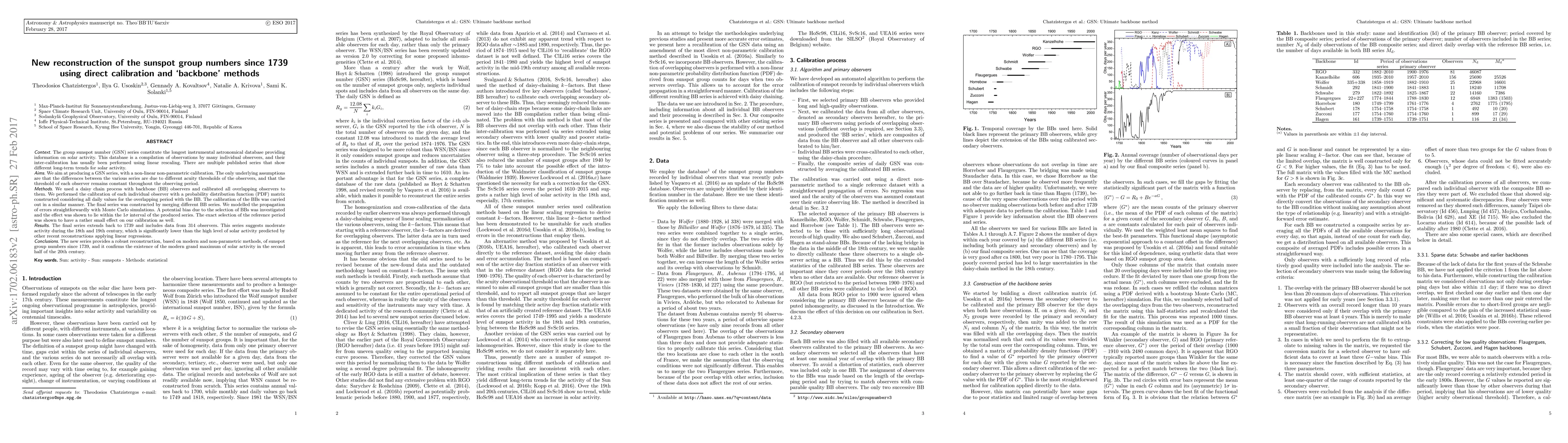 This paper reconstructs the sunspot group number series since 1739 using non-linear, non-parametric calibration methods, revealing moderate solar activity in the 18th and 19th centuries and confirming the Modern grand maximum in the 20th century. The reconstruction employs a daisy chain process with backbone observers and Monte Carlo simulations for error propagation.