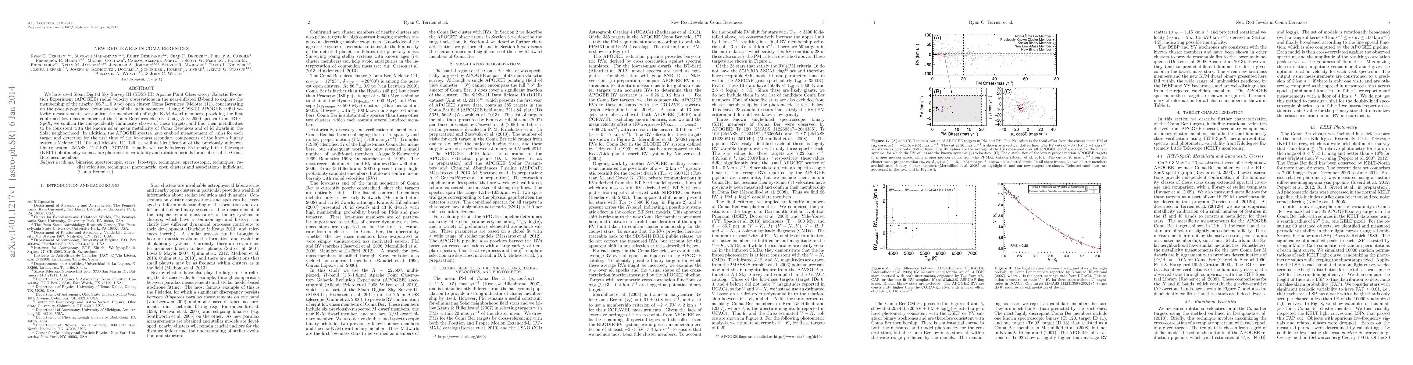 This paper confirms the membership of eight low-mass K/M dwarf stars in the Coma Berenices open cluster, utilizing SDSS-III APOGEE radial velocity data. It identifies new binary systems and measures rotation periods for cluster members, enhancing the understanding of the cluster's low-mass population.