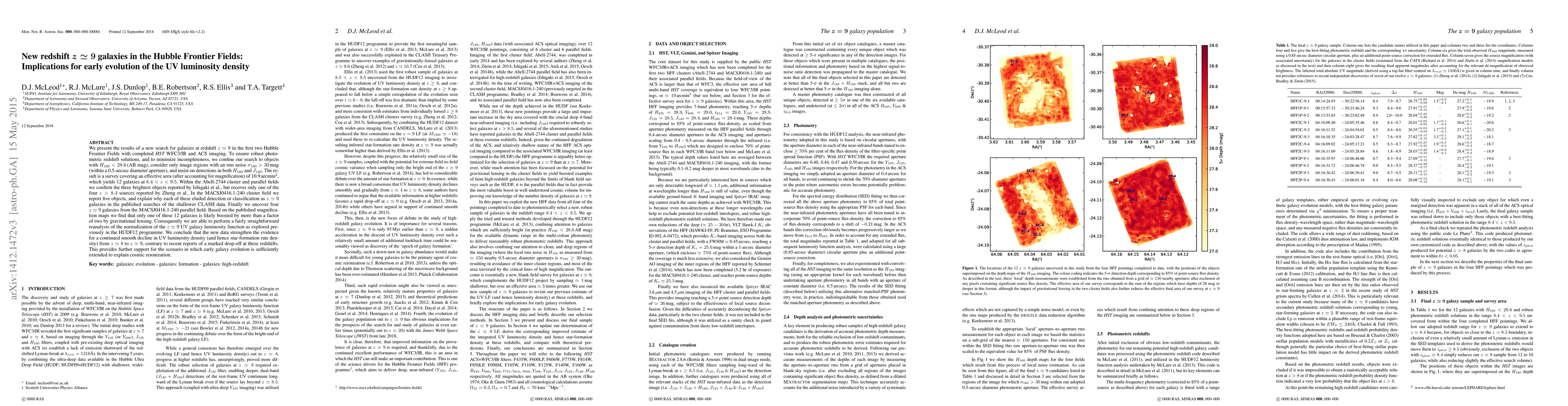 This study identifies 12 galaxies at redshift z ~ 9 in Hubble Frontier Fields, confirming previous findings while uncovering new objects. The results suggest a continued decline in UV luminosity density from z ~ 8 to z ~ 9, supporting early galaxy evolution models that extend to cosmic reionization.