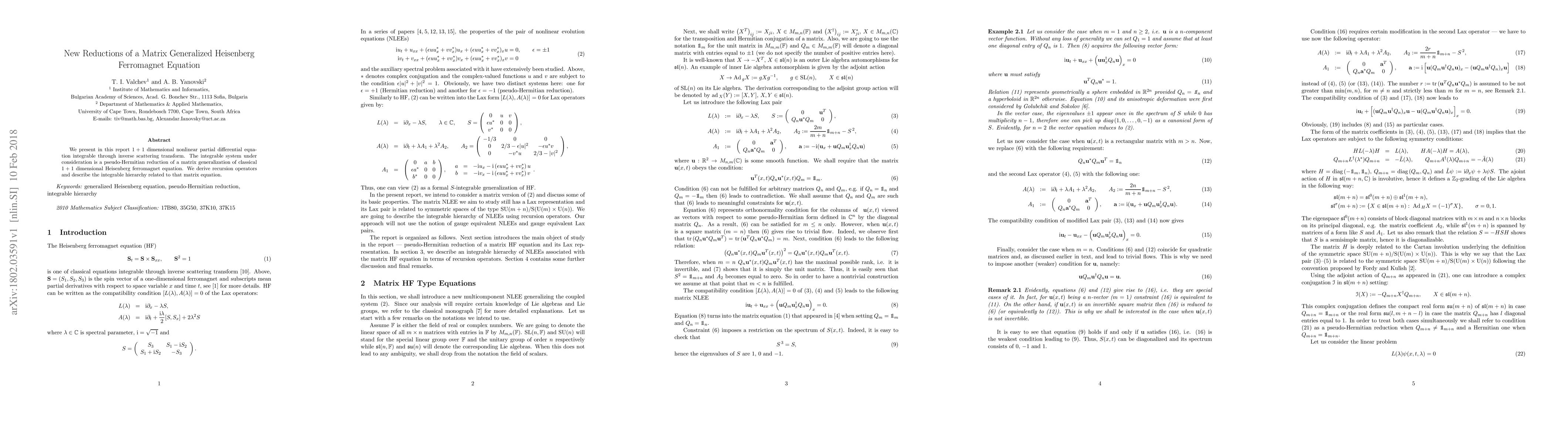 We present in this report 1+1 dimensional nonlinear partial differential equation integrable through inverse scattering transform. The integrable system under consideration is a pseudo-Hermitian reduction of a matrix generalization of classical 1+1 dimensional Heisenberg ferromagnet equation. We derive recursion operators and describe the integrable hierarchy related to that matrix equation.