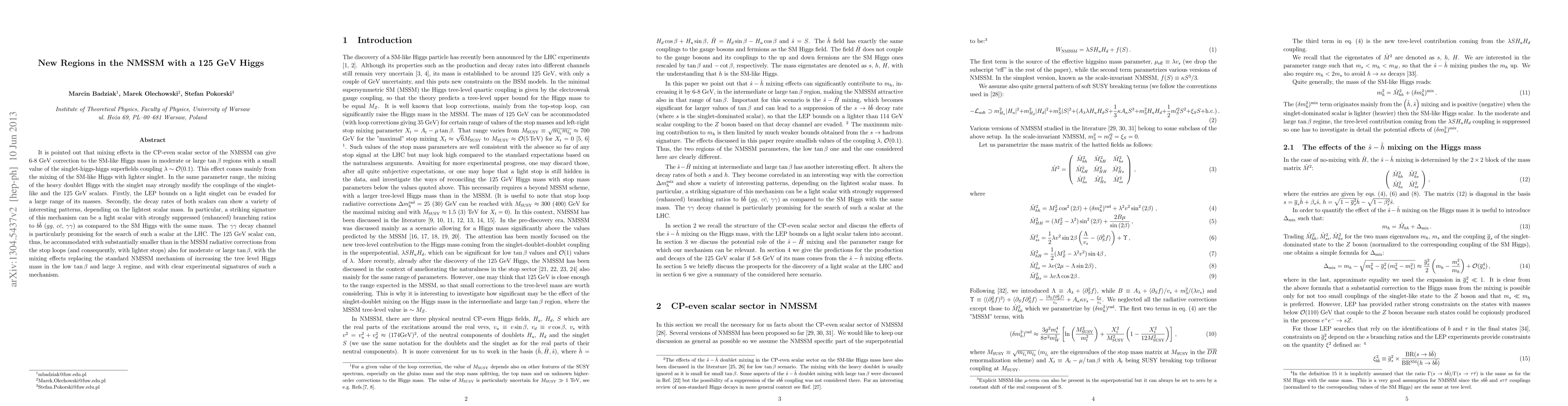 This paper explores new regions in the NMSSM where a 125 GeV Higgs boson can be accommodated through mixing effects in the CP-even scalar sector, particularly in moderate or large $\tan\beta$ regions. The study highlights that these effects can evade LEP bounds and lead to distinctive decay patterns, especially in the $\gamma\gamma$ channel, offering promising search avenues at the LHC.