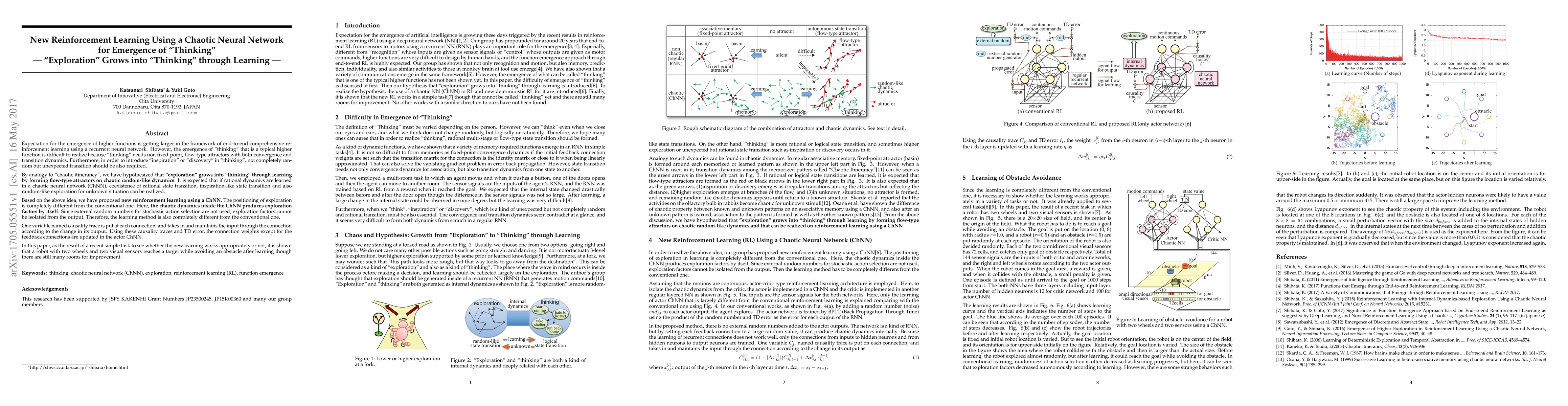 Expectation for the emergence of higher functions is getting larger in the framework of end-to-end reinforcement learning using a recurrent neural network. However, the emergence of "thinking" that is a typical higher function is difficult to realize because "thinking" needs non fixed-point, flow-type attractors with both convergence and transition dynamics. Furthermore, in order to introduce "inspiration" or "discovery" in "thinking", not completely random but unexpected transition should be also required. By analogy to "chaotic itinerancy", we have hypothesized that "exploration" grows into "thinking" through learning by forming flow-type attractors on chaotic random-like dynamics. It is expected that if rational dynamics are learned in a chaotic neural network (ChNN), coexistence of rational state transition, inspiration-like state transition and also random-like exploration for unknown situation can be realized. Based on the above idea, we have proposed new reinforcement learning using a ChNN as an actor. The positioning of exploration is completely different from the conventional one. The chaotic dynamics inside the ChNN produces exploration factors by itself. Since external random numbers for stochastic action selection are not used, exploration factors cannot be isolated from the output. Therefore, the learning method is also completely different from the conventional one. At each non-feedback connection, one variable named causality trace takes in and maintains the input through the connection according to the change in its output. Using the trace and TD error, the weight is updated. In this paper, as the result of a recent simple task to see whether the new learning works or not, it is shown that a robot with two wheels and two visual sensors reaches a target while avoiding an obstacle after learning though there are still many rooms for improvement.