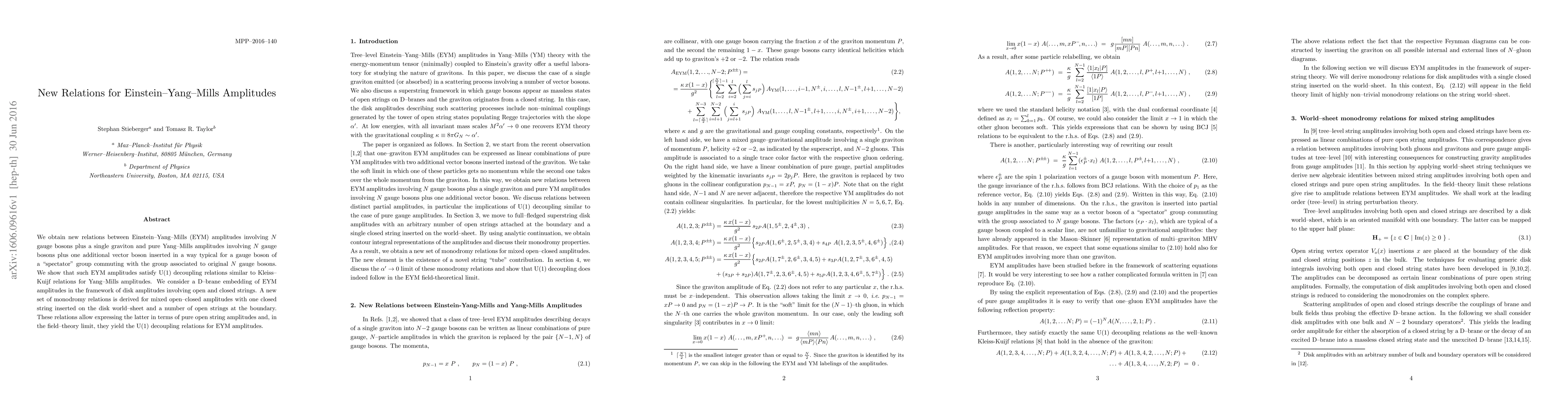 We obtain new relations between Einstein-Yang-Mills (EYM) amplitudes involving N gauge bosons plus a single graviton and pure Yang-Mills amplitudes involving N gauge bosons plus one additional vector boson inserted in a way typical for a gauge boson of a "spectator" group commuting with the group associated to original N gauge bosons. We show that such EYM amplitudes satisfy U(1) decoupling relations similar to Kleiss-Kuijf relations for Yang-Mills amplitudes. We consider a D-brane embedding of EYM amplitudes in the framework of disk amplitudes involving open and closed strings. A new set of monodromy relations is derived for mixed open-closed amplitudes with one closed string inserted on the disk world-sheet and a number of open strings at the boundary. These relations allow expressing the latter in terms of pure open string amplitudes and, in the field-theory limit, they yield the U(1) decoupling relations for EYM amplitudes.