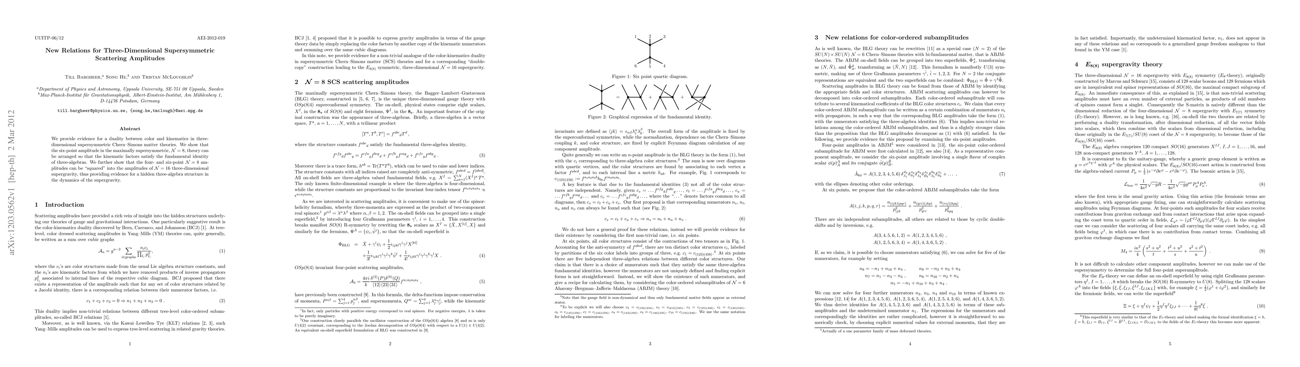 This paper reveals a duality between color and kinematics in three-dimensional supersymmetric Chern-Simons matter theories, demonstrating that the six-point amplitude in N=8 theory aligns with three-algebra identities. It also shows that four- and six-point N=8 amplitudes can be squared to match N=16 three-dimensional supergravity amplitudes, indicating a hidden three-algebra structure.