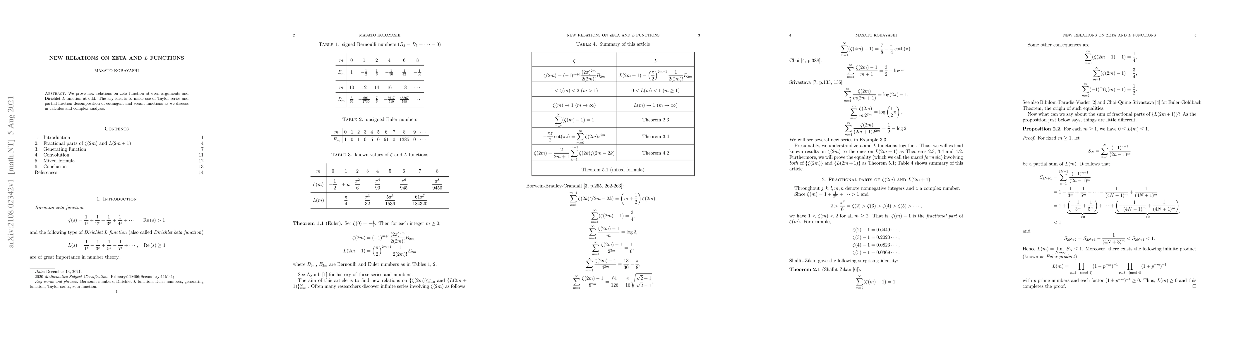 We prove new relations on zeta function at even arguments and Dirichlet $L$ function at odd. The key idea is to make use of the Taylor series and partial fraction decomposition of cotangent and secant functions as we discuss in calculus and complex analysis.
