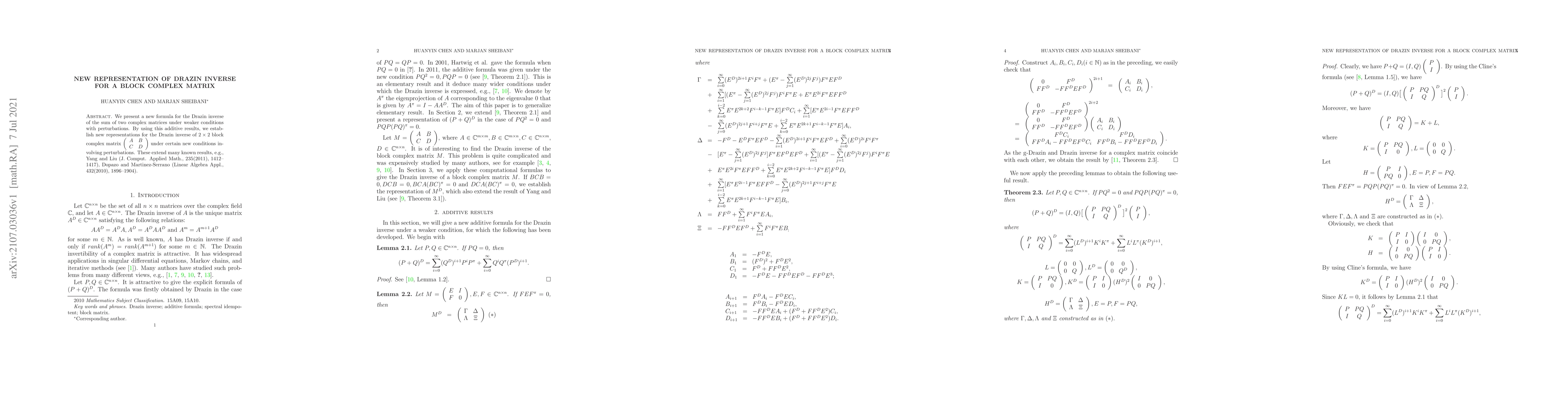 We present a new formula for the Drazin inverse of the sum of two complex matrices under weaker conditions with perturbations. By using this additive results, we establish new representations for the Drazin inverse of 2 \times 2 block complex matrix under certain new conditions involving perturbations.