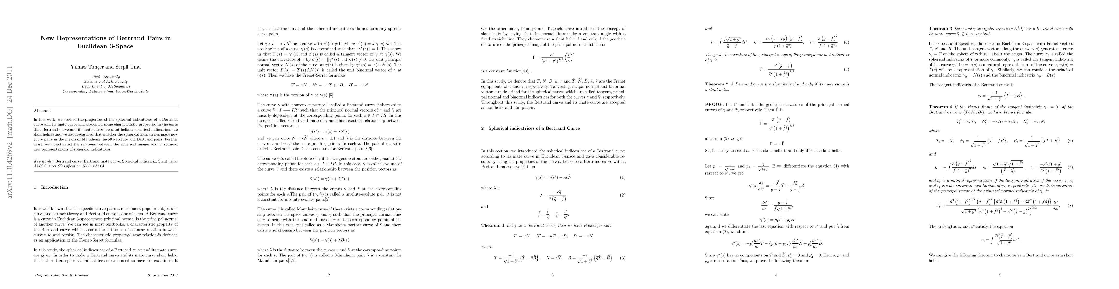 In this work, we studied the properties of the spherical indicatrices of a Bertrand curve and its mate curve and presented some characteristic properties in the cases that Bertrand curve and its mate curve are slant helices, spherical indicatrices are slant helices and we also researched that whether the spherical indicatrices made new curve pairs in the means of Mannheim, involte-evolute and Bertrand pairs. Further more, we investigated the relations between the spherical images and introduced new representations of spherical indicatrices.