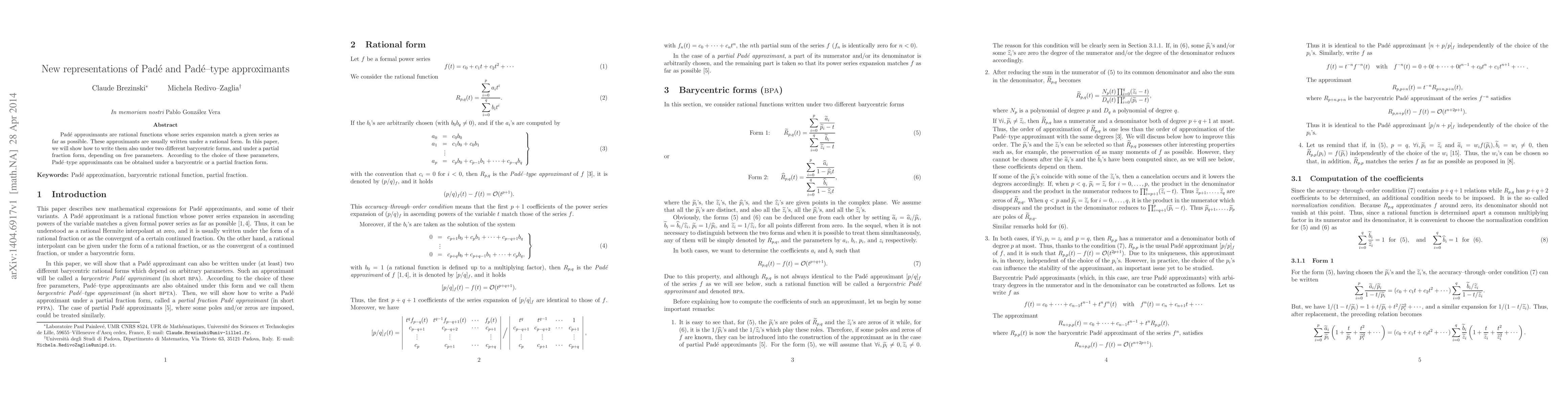 This paper introduces new representations of Padé approximants, including barycentric and partial fraction forms, alongside traditional rational forms, providing flexibility in their application through parameter selection.
