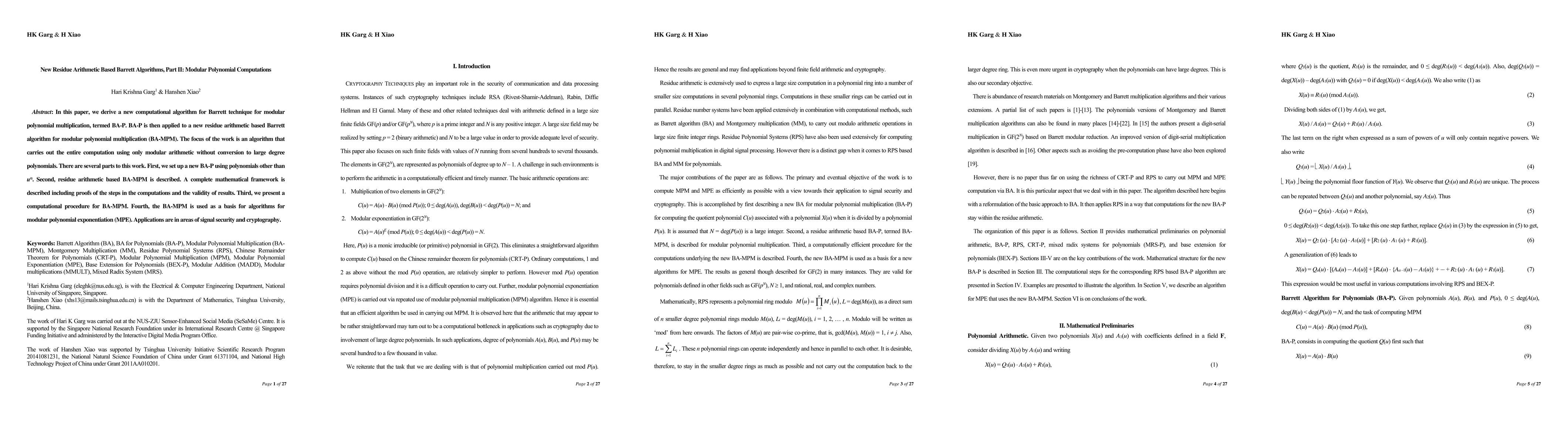 This paper introduces a new Barrett algorithm (BA-P) for modular polynomial multiplication (BA-MPM) that performs computations entirely in modular arithmetic without converting to large degree polynomials. The work includes a mathematical framework with proofs, a computational procedure for BA-MPM, and its application to modular polynomial exponentiation (MPE) for signal security and cryptography.