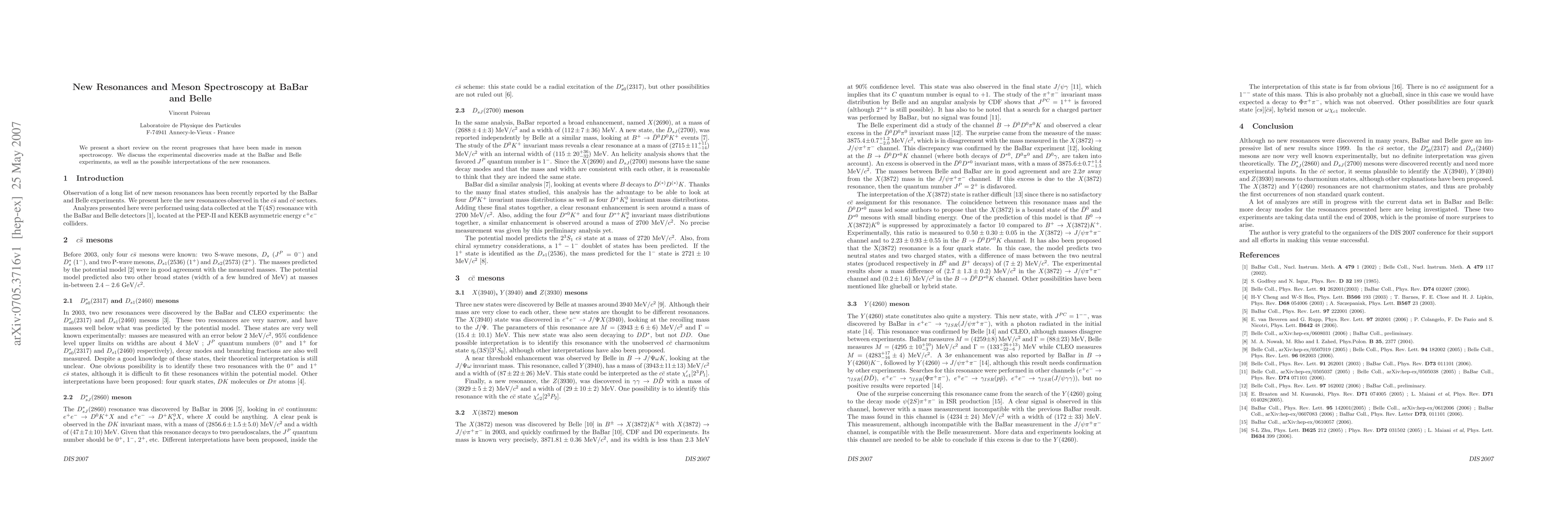 We present a short review on the recent progresses that have been made in meson spectroscopy. We discuss the experimental discoveries made at the BaBar and Belle experiments, as well as the possible interpretations of the new resonances.