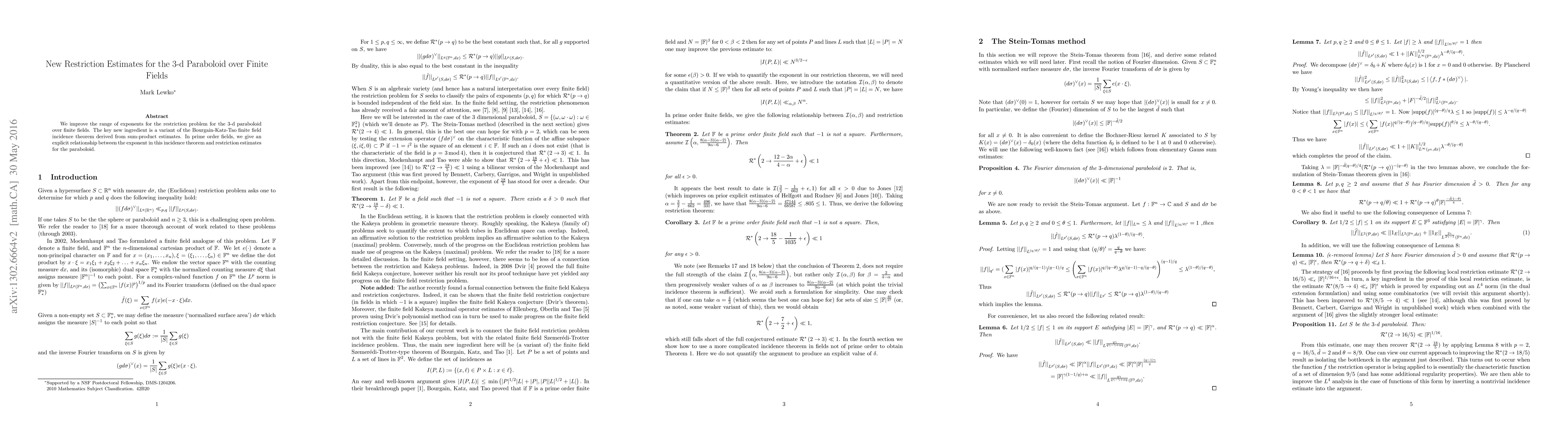 This paper enhances the restriction estimates for the 3-d paraboloid over finite fields by employing a novel variant of the Bourgain-Katz-Tao incidence theorem, derived from sum-product estimates, leading to improved exponent ranges. It also establishes an explicit connection between the incidence theorem's exponent and the paraboloid's restriction estimates in prime order fields.