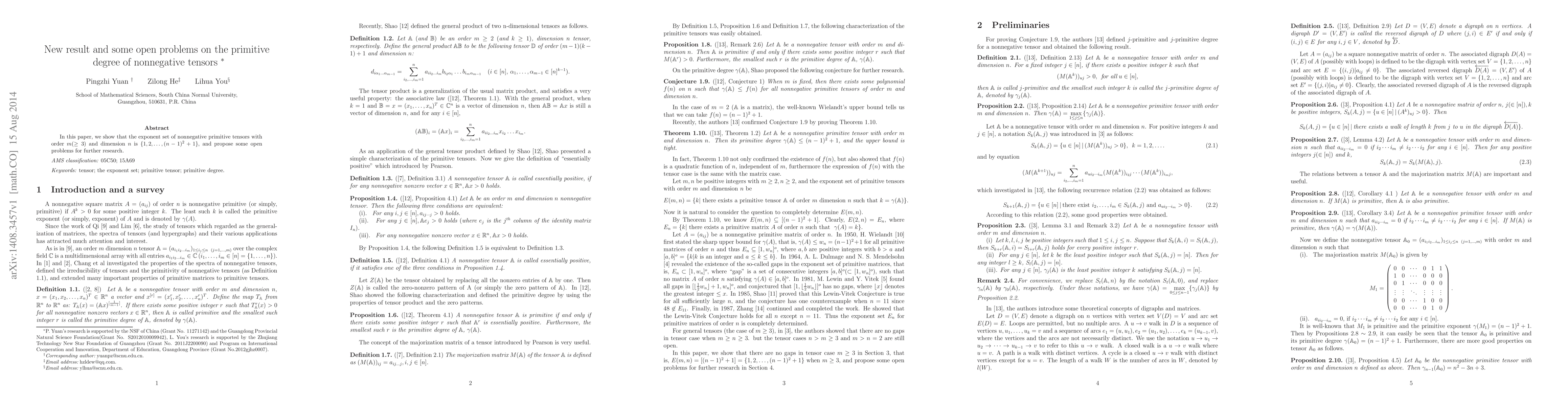 Summary: This paper establishes that the exponent set for nonnegative primitive tensors of order \(m \geq 3\) and dimension \(n\) is \(\{1,2,\ldots,(n-1)^2+1\}\). It also outlines several open problems for future research in this area.