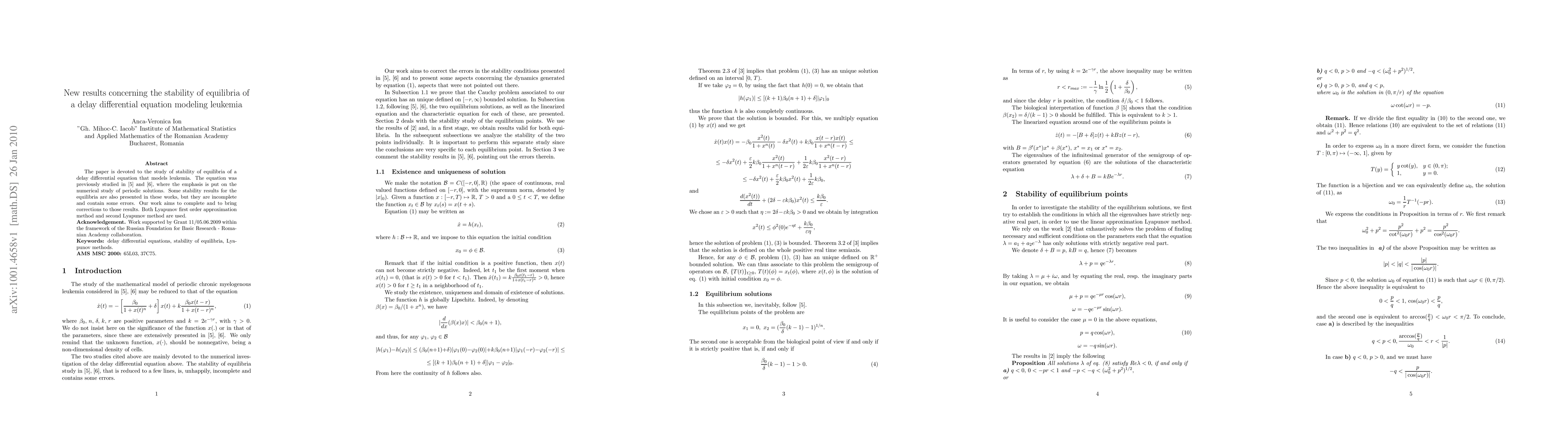 This paper corrects and completes stability results for equilibria in a delay differential equation model of leukemia, previously studied in [5] and [6], using both first and second Lyapunov methods to address prior errors and omissions.